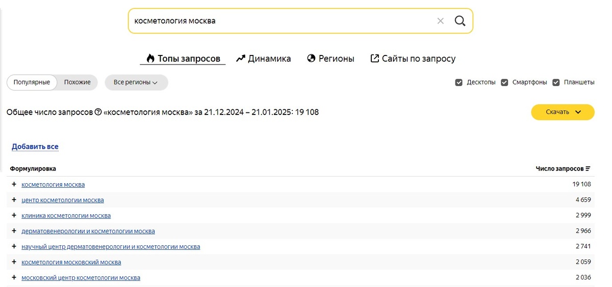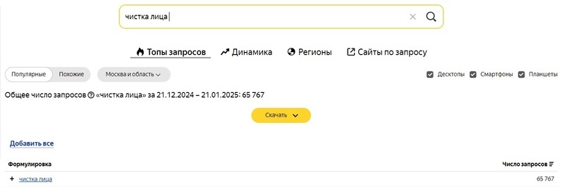 Наряду с этим, важно сформулировать ваше уникальное торговое предложение (УТП). Что именно отличает вас от конкурентов? Это может быть уникальная методика, опытные специалисты, современное оборудование, индивидуальный подход, гарантия результата или особые условия (акции, скидки, программы лояльности). УТП должно быть четко транслироваться в вашей рекламе. Независимо от того, какую платформу вы используете для размещения рекламы — будь то социальные сети, Яндекс.Директ, Яндекс.Бизнес — основные принципы остаются схожими. Ваши рекламные объявления должны быть понятными, привлекательными и убедительными.Но недостаточно просто запустить рекламу, важно постоянно отслеживать ее эффективность и вносить необходимые корректировки. Используйте аналитические инструменты, чтобы определить, какие каналы и объявления приносят вам больше всего клиентов. На основе полученных данных оптимизируйте свои рекламные кампании, чтобы добиться максимальной отдачи от инвестиций. Также важно помнить, что в сфере косметологии существует множество разнообразных услуг, включая медицинские. Для их рекламы в социальных сетях, в Яндекс, требуется наличие лицензии. Если вы планируете запустить рекламу для своей косметологической клиники, но у вас нет соответствующей лицензии, а ваши специалисты не имеют медицинского образования, то это будет нарушением закона. В таком случае к вам могут прийти с проверкой, и вы и специалист по рекламе будете оштрафованы. Таргетированная реклама — это реклама в социальных сетях (Вконтакте, Одноклассниках). Один из самых эффективных способов привлечения клиентов в сфере косметологии. Таргет позволяет точно нацелиться на нужную аудиторию и повысить конверсию.Преимущества такого вида рекламы: Начните с небольшого бюджета и постепенно увеличивайте его, если результаты будут положительными.Определите, какие показатели будут важны для вас: количество кликов, записей на процедуры и возвращаемость инвестиций (ROI).Обязательно следите за трендами в индустрии косметологии и социальных медиа, чтобы настроить рекламу на актуальные интересы и потребности вашей аудитории.И не забывайте учитывать изменения в поведении аудитории и новые возможности платформ, чтобы ваша стратегия всегда оставалась актуальной и эффективной. Контекстная реклама — это особый вид объявлений, которые отображаются на страницах поисковой системы Яндекс в соответствии с интересами, потребностями и запросами пользователей.Яндекс.Директ — это удобный сервис, позволяющий запускать контекстную и медийную рекламу на страницах Яндекса и его партнеров. Это еще один эффективный инструмент для привлечения клиентов в сфере косметологии. Он даёт возможность показывать объявления тем, кто уже проявил интерес к вашим услугам. Первое, с чего необходимо начать, — это с исследования ключевых слов. Определите, какие запросы используют ваши потенциальные клиенты. Используйте инструменты, такие как Яндекс.Wordstat для подбора ключевых слов.Какими это могут быть запросы: Разделите ключевые слова на группы, чтобы создать более релевантные объявления. Например, «уход за лицом», «инъекции», "аппаратная косметология«.Определите слова, по которым ваша реклама не должна показываться. Например, «бесплатно», «в домашних условиях», «обучение». После запуска не заб