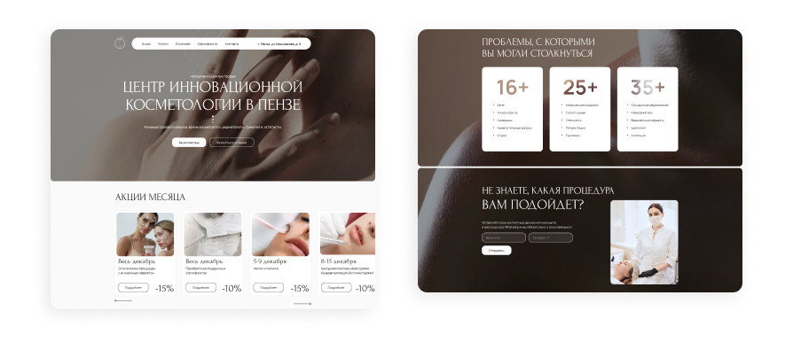 Мы разработали лендинг с удобной навигацией, чтобы пользователи могли без проблем найти все самое необходимое и не запутались во вкладках. Какую информацию мы осветили? Рассказали о самой косметологии, услугах, актуальных акциях, о специалистах и их работах, показали отзывы. Разработали pop-up, ориентированный на новых клиентов: выгодное предложение + форма заявки. В результате косметология стабильно получает заявки с сайта. При создании визуала мы использовали единую цветовую палитру, тонкие шрифты и графические элементы. Мы структурировали информацию в блоки меню и виджеты, чтобы облегчить навигацию. Цветовая палитра, которую мы использовали: Перед нами стояла задача — показать экспертность специалистов, увеличить аудиторию и узнаваемость косметологии. Что мы делали? Мы не только информировали о центре косметологии и услугах, но и рассказывали о преимуществах аппаратов, специалистах, проводили интерактивы. Также через истории мы закрывали распространенные возражения клиентов. Увеличился охват и вовлеченность аудитории в социальных сетях Значительно увеличилось количество обращений (заявки поступают как с сайта, так и с соцсетей) Выросла узнаваемость бренда и доверие к нему Сформирован положительный имидж компании: косметология регулярно получает отзывы, которые подчеркивают профессионализм специалистов, внимательное отношение к клиентам и видимые результаты процедур Остались вопросы? Пишите нам sales@frogz.ru