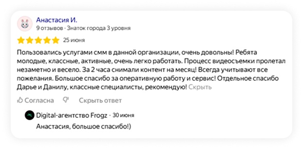 Параллельно с этим мы разработали единый стиль аккаунта, подобрав гармоничную цветовую палитру, использовав легкие, тонкие шрифты и аккуратные графические элементы. Мы не только информировали о центре косметологии и услугах, но и рассказывали о преимуществах аппаратов, специалистах, проводили интерактивы. Также через истории мы закрывали распространенные возражения клиентов. Видео — самый востребованный формат сегодня: именно через видеоконтент проще всего привлечь внимание и показать живую атмосферу, экспертизу специалистов и реальные эмоции клиентов. При этом на любой локации, даже без сложного оборудования и большого бюджета, можно сделать красивые и качественные ролики. Нам хватает всего 2 часов, чтобы отснять 12–15 роликов. Потому что перед съемкой у нас уже было готово техническое задание: прописаны участники, текст для каждого и примеры референсов. На месте оставалось только расставить оборудование и провести съемки. Мы наблюдаем заметный рост охватов и количества просмотров, что свидетельствует о возрастающем интересе аудитории. Но самое важное — это значительное увеличение переходов на онлайн запись и посещений социальных сетей, что напрямую влияет на привлечение новых клиентов и эффективность продвижения. Вконтакте Инстаграм После некоторого времени сотрудничества, клиент оставил положительный отзыв о работе с нами! Остались вопросы? Пишите нам sales@frogz.ru