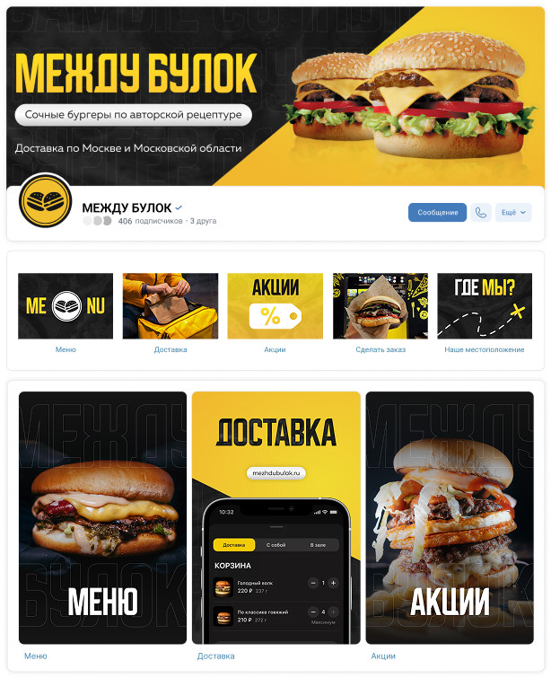 При создании визуала для соцсетей бургерной мы использовали единую цветовую палитру в черно-желтых тонах, ассоциирующихся с интерьером заведений.