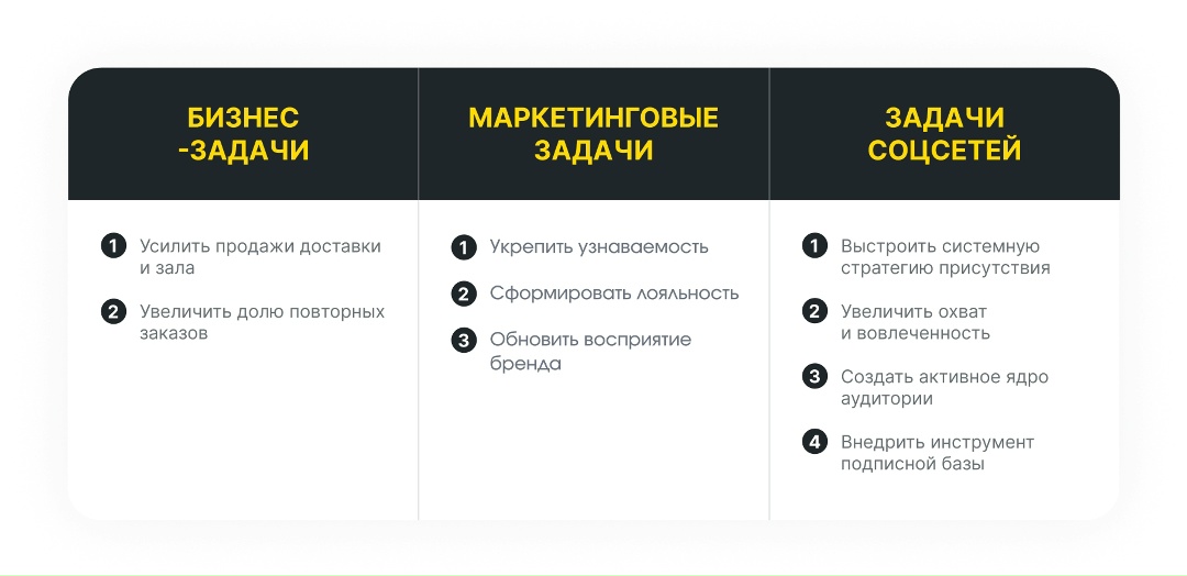 Мы провели аудит социальных сетей бренда: проанализировали структуру сообщества, проверили навигацию, оценили контент и визуальный стиль, изучили динамику подписчиков, проанализировали вовлеченность и провели аудит рекламного кабинета. Что было сделано? По итогам были выявлены ключевые направления для улучшения и оптимизации, определены точки роста и приоритеты для дальнейшего развития. ЭТАП 4. РАЗРАБОТКА ПОЗИЦИОНИРОВАНИЯ На основе проведенного анализа мы сформировали эмоциональное позиционирование для сети пиццерий и определили сегменты аудитории. Мы также определили ассоциативное поле бренда и прописали Tone of Voice — то, как бренд будет общаться с аудиторией.Кроме того, мы определили ключевые сообщения, которые бренд будет доносить, и наметили стратегическое направление дальнейшей коммуникации. ЭТАП 5. КОНТЕНТ-СТРАТЕГИЯ Мы перераспределили роли площадок, определили приоритетные каналы и выстроили единую логику взаимодействия с аудиторией. Разработали подробный рубрикатор, где каждая рубрика закрывала конкретную задачу по вовлечению, удержанию аудитории и формированию эмоциональной связи с брендом. Что важно? Ключевое изменение заключалось в переходе от агрессивного промо-контента и постоянных скидок к эмоциональной и ценностной коммуникации. ЭТАП 6. ПЛАТНЫЙ ТРАФИК Мы провели аудит рекламного кабинета, проанализировали эффективность существующих объявлений и выявили, какие связки работают лучше, а какие хуже. Также мы подобрали примеры рекламных форматов и подходов, которые могли бы быть применены для продвижения бренда. В результате проделанной работы мы сформировали прозрачную и детализированную SMM-стратегию с четкими направлениями и приоритетами для дальнейшего развития социальных сетей бренда. Остались вопросы? Пишите нам sales@frogz.ru