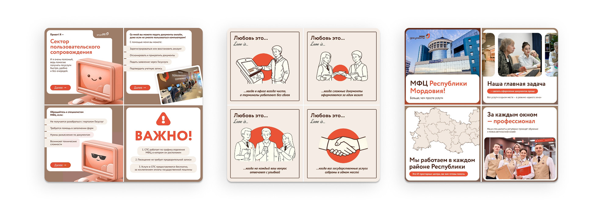 Дизайн разрабатывали в соответствии с брендбуком организации. Это позволило нам сохранить единый визуальный стиль и повысить узнаваемость бренда в цифровой среде. В результате соцсети стали более визуально привлекательными и понятными для пользователей.Цветовая палитра, которую мы использовали: Основной задачей SMM-продвижения стало повышение интереса людей к публикациям. Мы проанализировали, какие форматы контента в большей степени пользуются спросом у целевой аудитории и выявили для себя 2 основных формата: клипы Вконтакте и серии карточек. Мы продумываем мини-сценарии, через которые рассказываем об услугах и важной информации простым и понятным способом. Как мы и ожидали, такие публикации получили высокий отклик пользователей. Отдельным направлением работы стала съемка и монтаж роликов. Мы анализировали актуальные тренды и изучали, какие форматы роликов лучше всего набирают охваты. После этого мы адаптировали их под нашу аудиториюи специфику организации. С помощью этого формата не только увеличили охваты соц. сетей, но и повысили доверие аудитории к работе центра. МАХ — мессенджер, активно набирающий популярность благодаря своей стабильной работе без ограничений. Мы успешно адаптировались к новой площадке: канал был запущен нами с нуля. > 7 000 записей было оформлено на прием через чат-бот в МАХ У нас получилось значительно усилить присутствие ГАУ МФЦ Республики Мордовия «Мои документы» в соцсетях и повысить интерес аудитории к нашему контенту. Всю работу фактически пришлось выстраивать заново, ведь страницы практически не имели стабильных охватов и активной вовлеченности. > 500 новых подписчиков в MAX > 200 новых подписчиков во ВКонтакте > 200 новых подписчиков в Telegram Остались вопросы? Пишите нам sales@frogz.ru