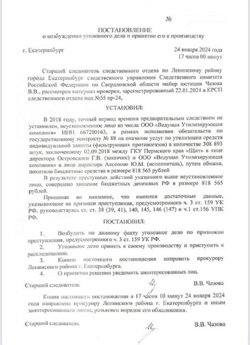 В 2018 году ООО «Ведущая Утилизирующая Компания» по заказу ГКУ Пермского края «Щит» якобы намеревалась принять от госструктуры противогазы. За утилизацию инвентаря мошенники получили 818 565 рублей. Но в реальности Аксенов даже не думал выполнять заявленную работу. Он просто присвоил почти миллион.