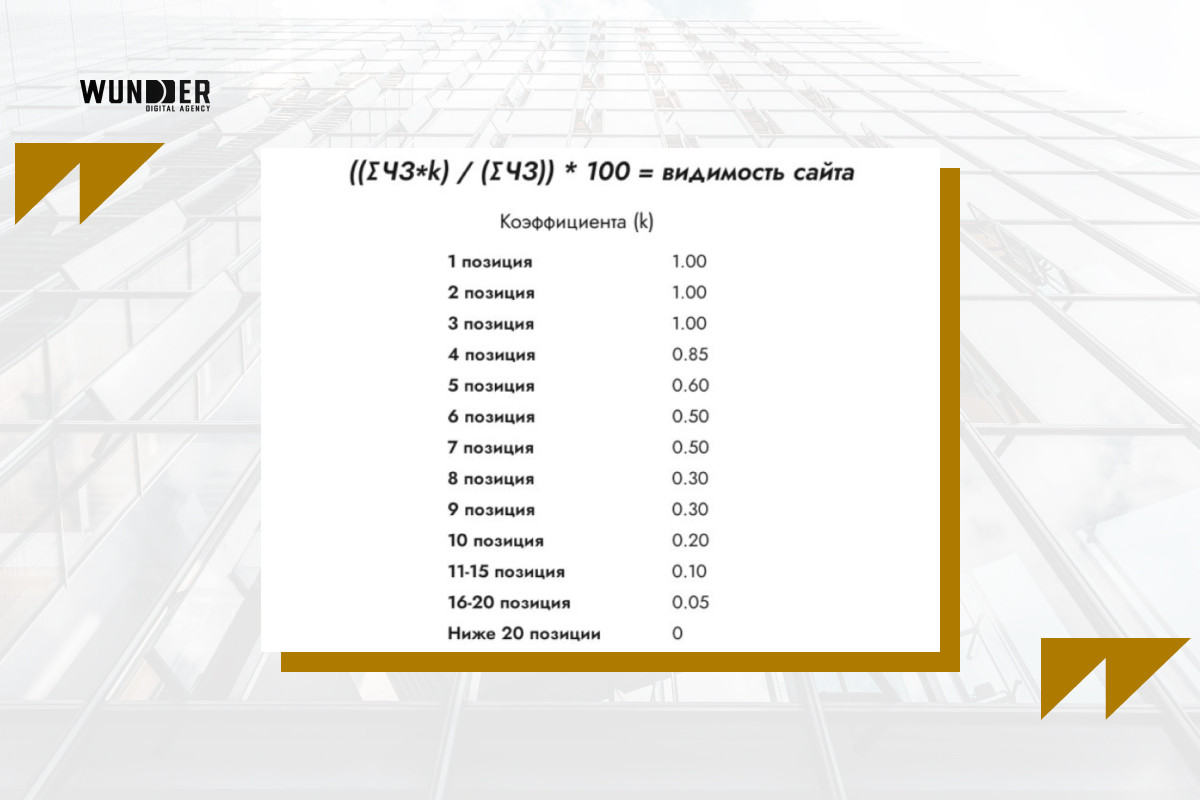 В — видимость сайта ЧЗ — частота запроса k — коэффициент позиции При расчете коэффициента (k) учитывается вероятность того, что