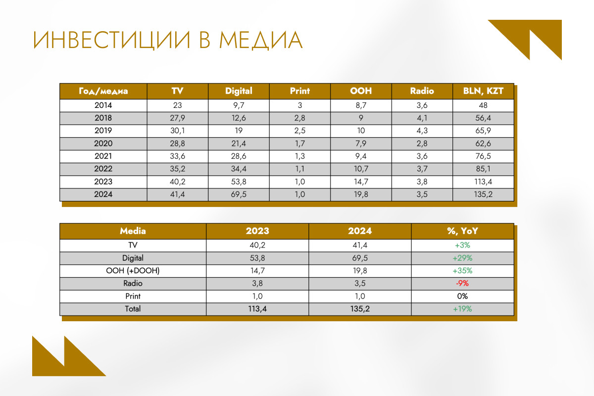 В 2024 году объем медиарынка Казахстана достиг исторического максимума — 135 млрд тенге. Основными драйверами стали digital и OOH-реклама (включая DOOH), показав рост на 29% и 35%, соответственно.