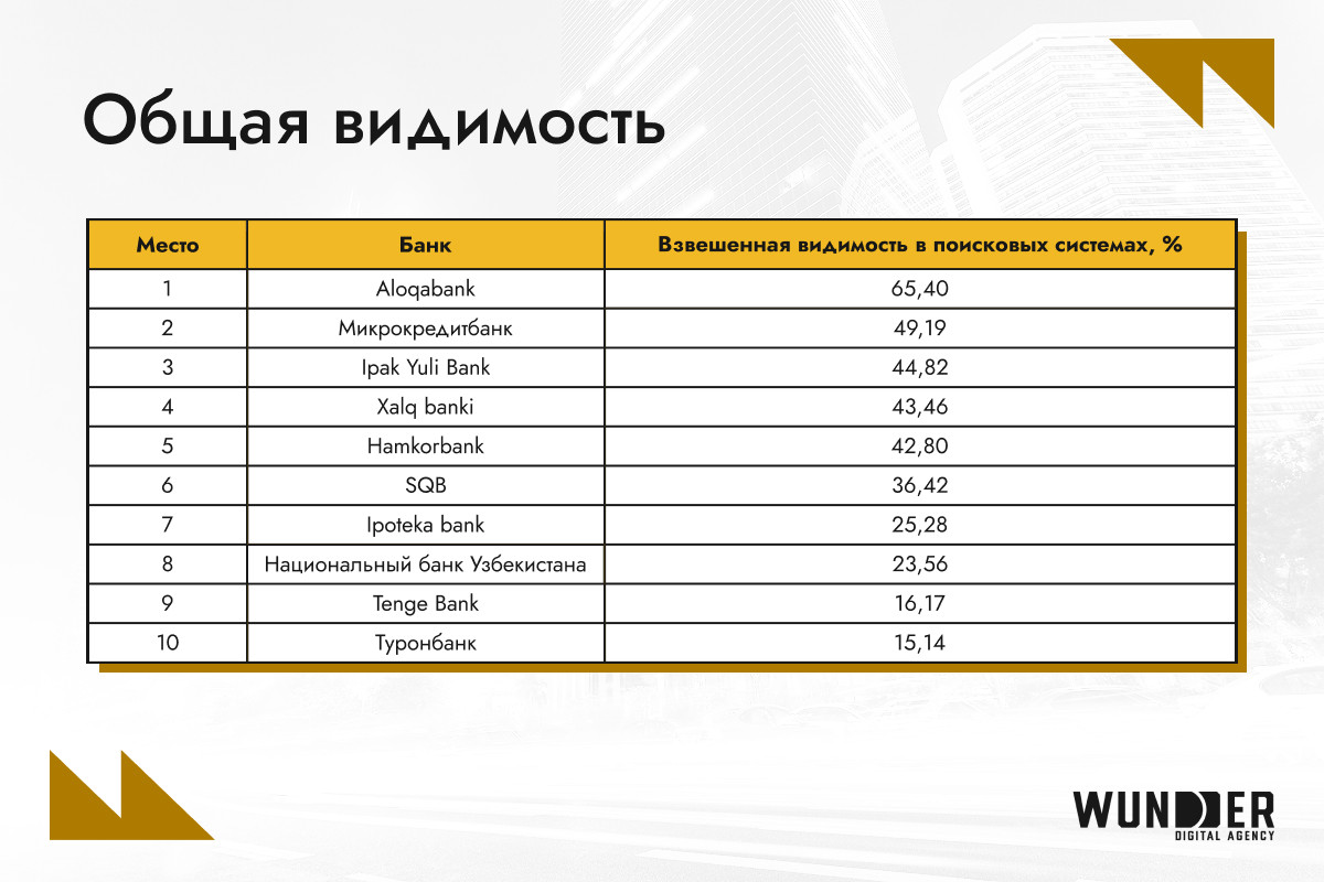 В расширенное исследование впервые попали организации Xalq banki и SQB, за которыми закрепились четвертое и шестое места. Читайте подробнее в таблице. Первое место в этом поисковике занял Aloqabank (66,39%). На второй позиции — «Микрокредитбанк» с показателем 53,61%. Xalq banki (48,11%) стал третьим, сделав упор на SEO-продвижение в Google. Читайте подробнее в таблице. Лидером данной платформы стал Ipak Yuli Bank (58,46%). Aloqabank (56,51%) занимает вторую позицию. На третьем месте — Hamkorbank (54,27%). Читайте подробнее в таблице.