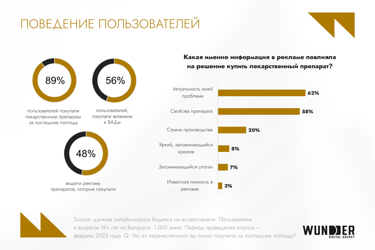 Мотивы покупки остаются довольно прагматичными. Чаще всего потребители обращаются к препаратам из-за болезни (51%). Реже они формируют аптечку «про запас» (30%) или приобретают средства для профилактики (19%). На финальное решение в большей степени влияет рекомендация врача и личный опыт. Для медицинских специалистов по-прежнему важнейшим фактором остается узнаваемость бренда. Все заметнее становится тренд на онлайн-покупки: около 30% пользователей готовы заказывать лекарства, витамины и БАДы в интернете. Для них важны прежде всего цена, возможность сравнивать предложения и удобство оформления. В этом плане особую роль играют тематические площадки 103.by и tabletka.by. Здесь пользователи не только выбирают препараты, но и активно сопоставляют аптеки и условия покупки. Высокая конкуренция заставляет фармбренды строить системный подход к продвижению. В центре внимания — digital-каналы: поиск, динамические баннеры, социальные сети и аптечные порталы. При этом необходимо учитывать сезонность. Формировать узнаваемость и лояльность лучше заранее, через охватные кампании, а в высокий сезон усиливать performance-рекламу, чтобы работать с «горячим» спросом. Инвестиции в digital растут: только в 2024 году вложения в медийную рекламу увеличились втрое, особенно заметен рост видеоформатов (51% от всех инвестиций) и баннеров (44%). Мобильная оптимизация становится обязательным условием: основная часть рекламного трафика приходится на смартфоны. Еще одна особенность поведения аудитории заключается в том, что люди часто ищут решение по симптомам, а не по бренду. Это значит, что контент должен отвечать на вопрос «как решить проблему» и только после этого подводить к конкретному продукту. Фармацевты и врачи продолжают оставаться важными каналами доверия. Для работы с ними брендам полезны обучающие материалы, карты выгод и программы стимулирования. Но не менее значимо направление удержания клиентов. Кампании, нацеленные на уже существующую аудиторию, приносят на 50% больший ROI по сравнению с акцентом исключительно на новых покупателях. Это делает важными напоминания о курсе приема, персонализированные рекомендации и коммуникацию после покупки. Онлайн-аптеки, где растет доля бронирований и заказов, становятся еще одним ключевым звеном в этой системе. Чтобы удерживать внимание потребителя и сокращать путь от знания к покупке, брендам необходимо быть активными на каждом этапе. На уровне формирования знания важна широкая коммуникация через видео, баннеры, соцсети, блогеров и аптечные порталы. Когда речь идет о создании спроса, ключевыми инструментами становятся динамические баннеры, социальные сети и поиск по симптомам. А в момент обработки спроса главную роль играют аптечные порталы, брендовый и транзакционный поиск. Особое внимание стоит уделять креативу. Короткие видеоролики длиной 15-30 секунд, яркий брендинг и ключевой месседж в первые секунды, дизайн под мобильные устройства и просмотр без звука делают коммуникацию эффективной. Белорусский фармрынок становится все более цифровым: аудитория ищет препараты онлайн, сравнивает цены и готова покупать через интернет‑аптеки. Однако знание бренда не гарантирует лояльности: половина потребителей легко переключается на конкурентов. В таких условиях выигрывают те бренды, которые управляют всей воронкой — от з