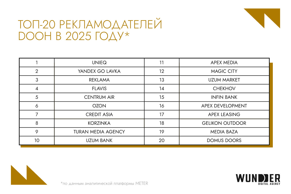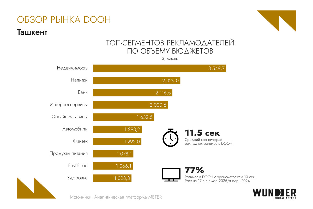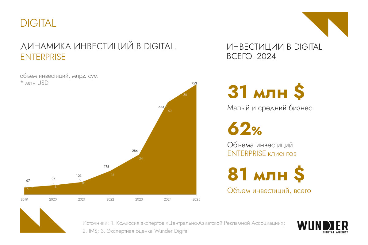 Наружная реклама продолжает усиливать свои позиции — в первую очередь за счет роста сегмента DOOH и повышения прозрачности медиапланирования. В 2025 году цифровые форматы занимают около 35% всего наружного инвентаря в Узбекистане. Особенно активно DOOH используют компании из сферы недвижимости, производители напитков и банки. Для FMCG-брендов и девелоперов это направление становится ключевым каналом при построении высокой узнаваемости и максимального охвата. Однако именно digital сегодня становится центром притяжения новых бюджетов, инновационных решений и высоких ожиданий по эффективности. С 2019 по 2025 объем инвестиций в digital вырос с 67 до 753 млрд сум в год — увеличение в более чем 11 раз отражает масштабные изменения в стратегиях размещения как крупных, так и средних игроков. При этом важным участником цифрового рынка стал малый и средний бизнес. Несмотря на ограниченные бюджеты, именно массовость размещений со стороны МСБ значительно влияет на конкуренцию в рекламных аукционах. Ключевыми инструментами медиамикса для этого сегмента остаются платформы Meta* (Facebook*, Instagram*), а также Google Ads — они позволяют гибко управлять бюджетами и быстро тестировать гипотезы, что критически важно для небольших компаний, работающих в высококонкурентной среде. ТВ, наружная реклама и digital — три основных канала с высоким уровнем проникновения в Узбекистане, которые обеспечивают более 90% охвата в городах с населением от 100 тысяч человек. В более мелких городах и сельской местности охват также остается высоким благодаря TV и digital, несмотря на несколько более низкую скорость интернета в некоторых регионах. Вместе с этим, по данным исследования INTERNEWS, медиапотребление отличается по качеству: аудитория ТВ в основном взрослая, в то время как интернет-аудитория значительно моложе и проводит больше времени в медиа. Молодые люди активно используют цифровые платформы, что делает их ключевыми для стратегий, ориентированных на эту группу. Согласно последним исследованиям, среднее время, которое интернет-аудитория тратит на медиа в день, составляет 3,5 часа. Это свидетельствует о высоком уровне вовлеченности в контент с сильным акцентом на новости, видео и общение в социальных сетях и мессенджерах. Средний возраст активных пользователей — 28 лет, при этом 51% из них составляют мужчины. В то же время потребление ТВ остается важным компонентом медиапространства страны, особенно среди взрослой и женской аудитории. Средний возраст зрителей — 38 лет. Наиболее популярными каналами остаются SEVIMLI TV, ZO’R TV, MILLY TV, MENING YURTIM и AQLVOY, которые предлагают разнообразный контент: развлекательный, образовательный, музыкальный. Для достижения максимального охвата и вовлеченности рекомендуем придерживаться следующих рекомендаций. Digital-рынок Узбекистана в 2025 году демонстрирует зрелый рост и активную трансформацию. Цифровые каналы становятся ключевыми в медиастратегиях брендов, а малый и средний бизнес — важными участниками рынка. Рост инвестиций, изменение медиапотребления и развитие технологий формируют новые правила игры. В условиях растущей конкуренции и медиаинфляции выигрывают те, кто выстраивает омниканальные стратегии и эффективно управляет бюджетами. Digital становится не просто каналом — он становится центром всей коммуникационной экосистемы. *Cоциальные сети Instagram и Facebook за