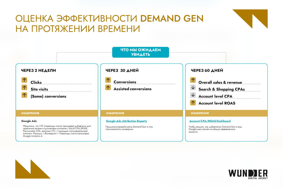 — Ключевую роль играет YouTube: по данным внутренних исследований платформы, пользователи в 2 раза чаще открывают для себя новые бренды и продукты именно здесь, чем на других площадках. Кроме того, согласно исследованиям Ipsos для Google, зрители считают рекламу на YouTube на 16% более достоверной и надежной, чем на других видео- и социальных платформах. Чтобы получить максимальную отдачу от Demand Gen, важно следовать структурированному подходу: Demand Gen обучается на данных о конверсиях. Для эффективного старта используйте Power Pack: объедините Demand Gen с Performance Max или Поиском. Так кампания быстрее «научится» находить релевантную аудиторию. Фаза обучения: ~2 недель AI обучается на уровне группы объявлений, поэтому консолидация улучшает эффективность. Объединяйте все релевантные интересы аудитории в одну группу объявлений (например, «бейсбол» и «футбол» объедините как «спорт»). Для достижения наилучших результатов убедитесь, что группа объявлений позволит получить минимум 50 конверсий в первые 30 дней. 3. Креатив как основной драйвер Demand Gen — это визуальный инструмент, где креативы являются ключевым фактором успеха. Поскольку Demand Gen работает в средней части воронки, его влияние нельзя оценивать только по прямым конверсиям. Фокусируйтесь на этих метриках: 1. VTC (View-Through Conversions): используйте VTC для сравнения метрик в одинаковых условиях с Social CPA/ROAS. Формула: Расходы / (Конверсии + Переходы после просмотра). 2. Отчеты по атрибуции Google Ads: проследите, как Demand Gen участвует в пути пользователя к конверсии (ассоциированные конверсии). 3. Общая эффективность аккаунта: зафиксируйте, как добавление Demand Gen в Google-микс влияет на общий CPA/ROAS аккаунта. Demand Gen способен усиливать существующие перформанс-кампании (Поиск, PMax). Один из крупнейших онлайн-магазинов музыкальных инструментов столкнулся с проблемой высокого ДРР (43,83%) и несистемными кампаниями. Цель: вывести рекламу на уровень положительной рентабельности, удерживая ДРР в пределах ≤20%. Специалисты инновационного хаба Wunder Digital в сплит инструментов, наряду с PMax и Поиском включили Demand Gen. Также были применены стратегии с максимальной ценностью конверсий, работа с аудиторными сигналами и регулярная оптимизация. Результат: Итог: канал PMax стал основным источником продаж, подпитываемый «теплой» аудиторией от Demand Gen, а реклама достигла положительной рентабельности. Лизавета Елиневич: — Demand Gen — это стратегический ответ на проблему ограниченного спроса и нелинейного клиентского пути. С помощью AI, поведенческих сигналов и персонализированных визуальных креативов он встраивает бренд в ранние этапы решения, создавая «теплую» аудиторию, которая впоследствии конвертируется быстрее и дешевле в перформанс-кампаниях. Правильная интеграция Demand Gen в рекламную экосистему позволяет снизить ДРР, увеличить выручку более чем в два раза и выйти на устойчивую рентабельность, даже в продуктах с долгим циклом сделки и B2B-проектах.