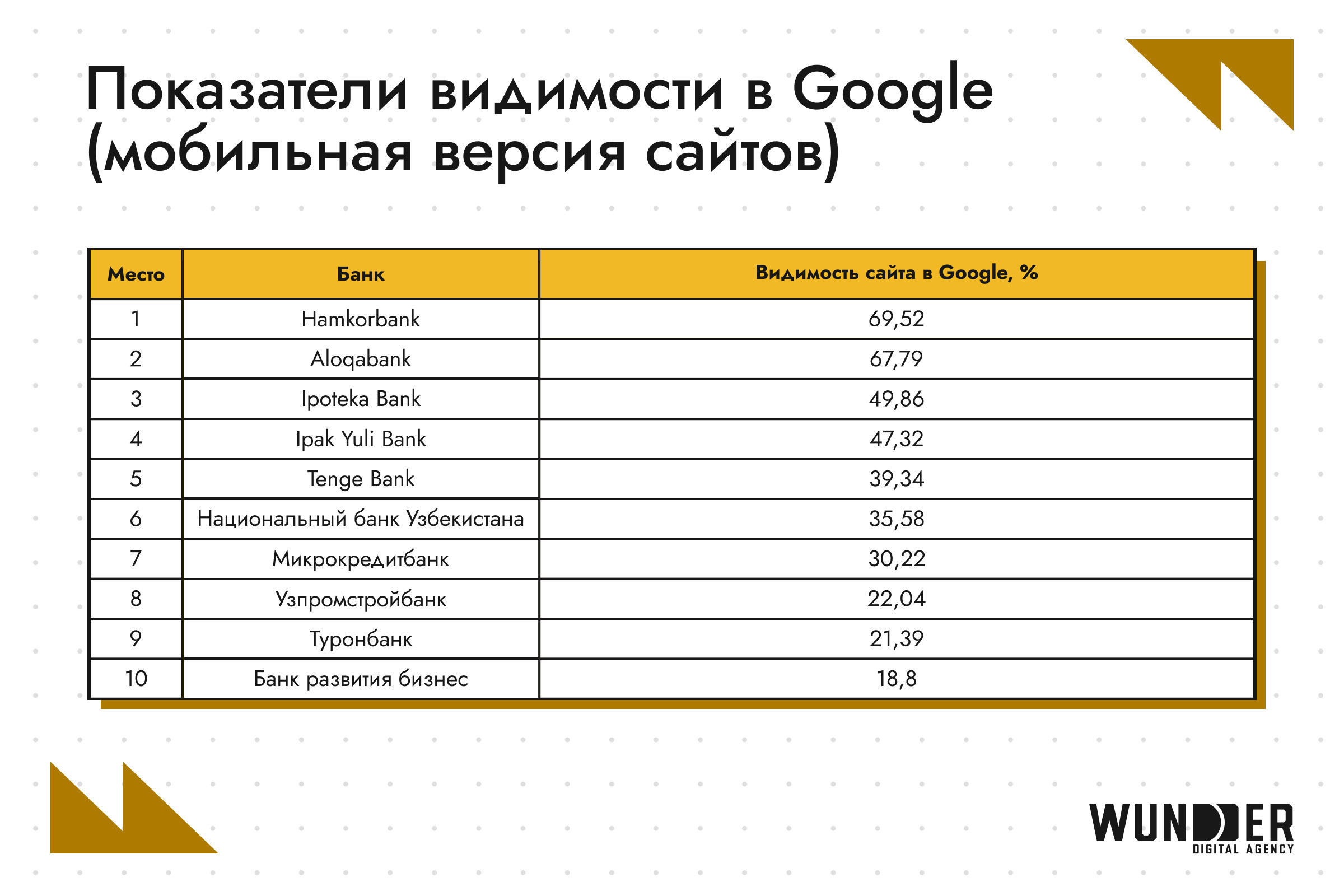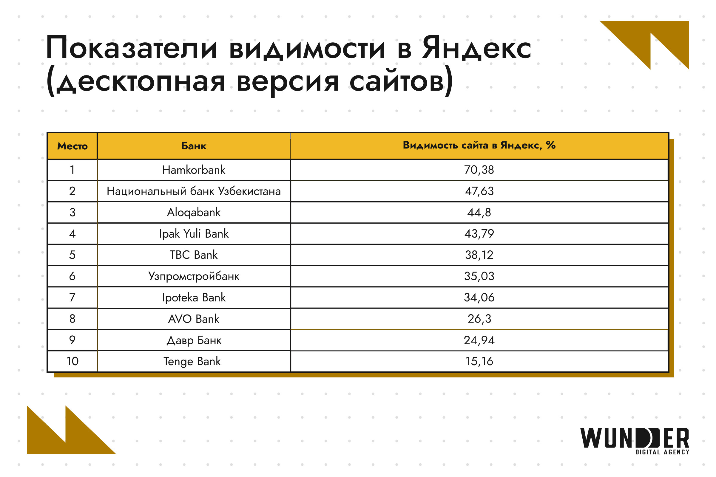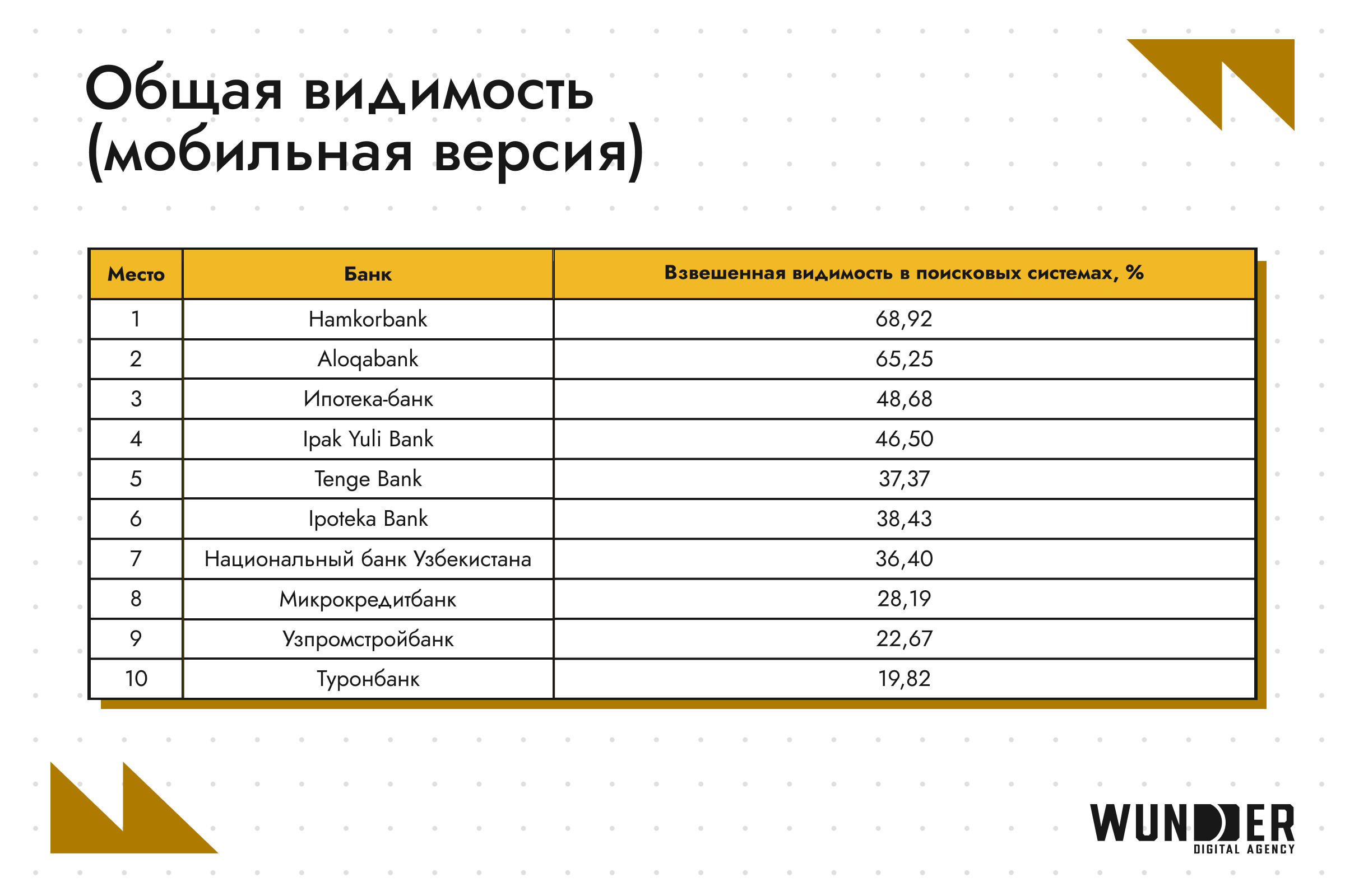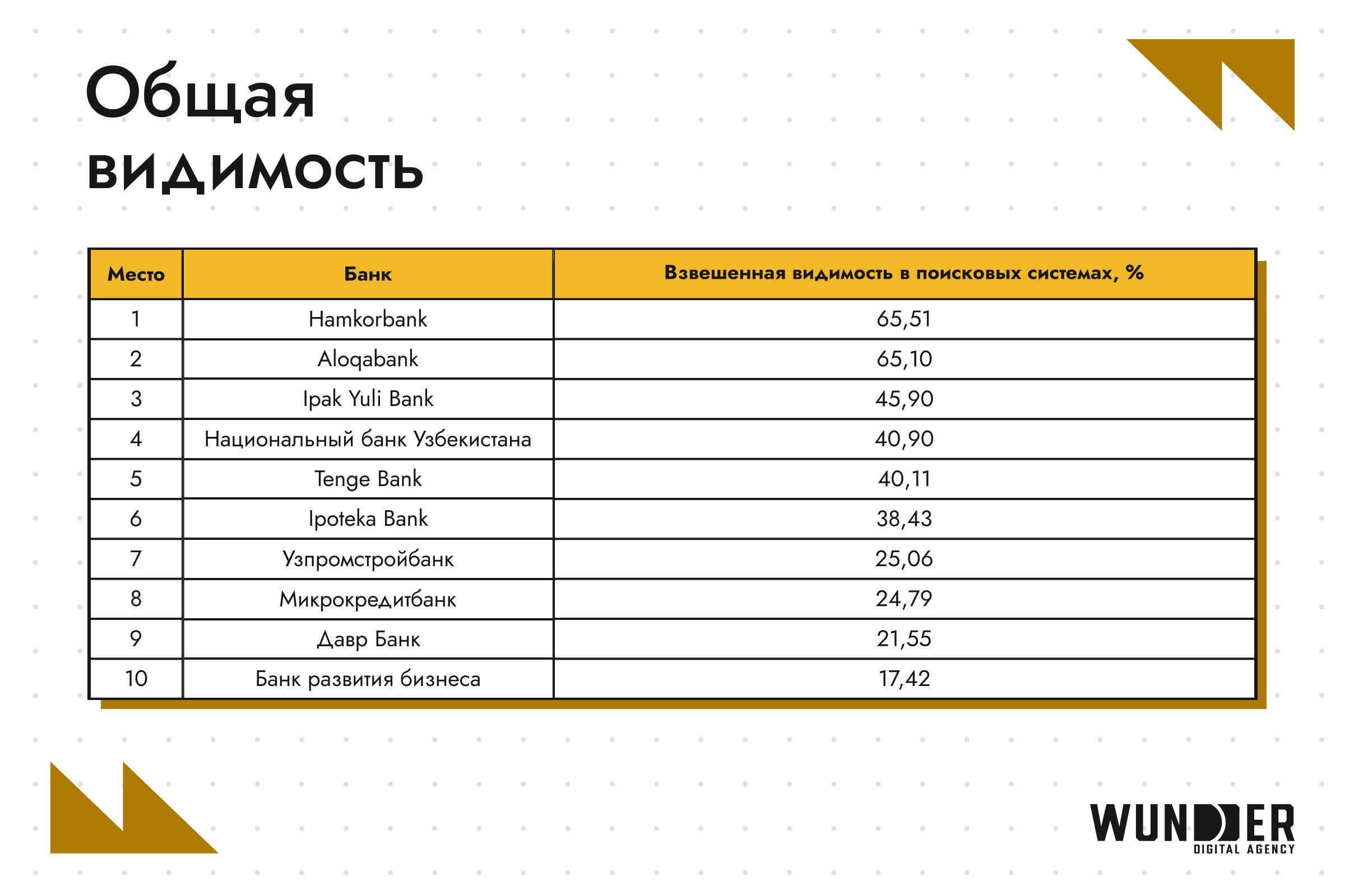 В феврале 2026 года лидерами остаются Hamkorbank (65,51%) и Alоqabank (65,10%), которые значительно опережают остальных участников по общей видимости. Третье место занимает Ipak Yuli Bank (45,90%), который немного отстает от второй позиции, но все же сохраняет высокую видимость в поисковых системах. Данные по всем банкам рейтинга можно найти в таблице. В феврале 2026 года лидерами по видимости в Google стали Aloqаbank (67,35%), Hamkorbank (64,97%) и Ipak Yuli Bank (46,13%). Эти банки демонстрируют высокие результаты, укрепляя свои позиции в поисковой системе и привлекая внимание пользователей. Данные по всем банкам рейтинга можно найти в таблице. В Яндексе явным лидером является Hamkorbank (70,38%), за ним следуют Национальный банк Узбекистана (47,63%) и Aloqаbank (44,8%). Данные по всем банкам рейтинга можно найти в таблице. Первую позицию в текущем году занимает Hamkorbank (68,92%). Это существенный рост по сравнению с 2025, когда лидером был Aloqabank (65,40%). Очевидно, что Hamkorbank сильно вырос: с 42,80% и 5-го места в 2025 — до лидерства сейчас. Aloqabank на второй позиции с видимостью 65,25%. Хотя это немного ниже, чем в прошлом году (65,40%), но банк сохраняет свою конкурентоспособность. Замыкает тройку лидеров Ipoteka Bank с видимостью 48,68%. Это большой прогресс: в 2025 банк был только седьмым с 25,28 %. Данные по всем банкам рейтинга можно найти в таблице. Hamkorbank занимает первое место с 69,52%, опережая Aloqabank, показатели которого за полгода выросли с 66,39% до 67,79%. Однако в рейтинге это теперь только вторая строчка: в 2025 Aloqabank был лидером. Данные по всем банкам рейтинга можно найти в таблице. Ipak Yuli Bank замыкает тройку лидеров с видимостью 49,86 %. Это заметно выше, чем в 2025 году, когда третье место занимал Xalq Banki с 48,11 %. Таким образом, в текущем году первые три позиции показывают значительное улучшение по сравнению с прошлым годом. На февраль 2026 года Hamkorbank занимает первую строчку с результатом 63,51%, значительно опережая конкурентов. Это большой рост: в прошлом году он был только третьим с видимостью 54,27%. На втором месте в 2026 году Национальный банк Узбекистана с результатом 43,75%, в то время как в прошлом году вторую позицию занимал Aloqabank с видимостью 56,51%. В текущем году он опустился на третью строчку с (42,36%), что также ниже, чем его показатели в 2025 году. Данные по всем банкам рейтинга можно найти в таблице. Очевидно, что SEO является важнейшим инструментом для эффективного цифрового продвижения банков. Оптимизация сайтов под различные языковые сегменты и улучшение их видимости в поисковых системах позволяют не только привлекать целевую аудиторию, но и укреплять позиции в конкурентной среде. С помощью грамотной SEO-стратегии банки могут повысить свою узнаваемость, улучшить взаимодействие с клиентами и повысить конверсии через онлайн-каналы.