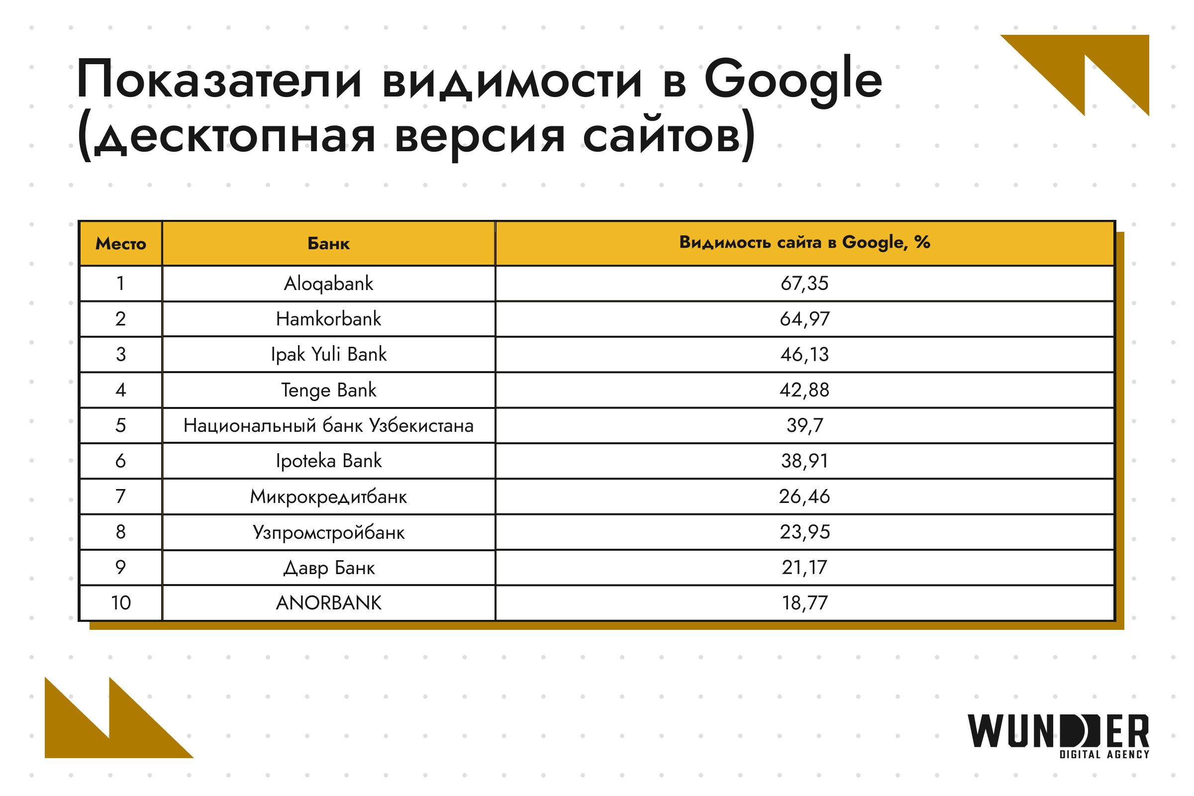 В выборку попали 33 банка, работающие в Узбекистане, анализ онлайн-присутствия которых был проведен в поисковых системах Google и Яндекс, как в мобильных, так и в десктопных версиях. В отличие от предыдущих исследований, теперь принимались во внимание запросы как на узбекском, так и на русском языках.