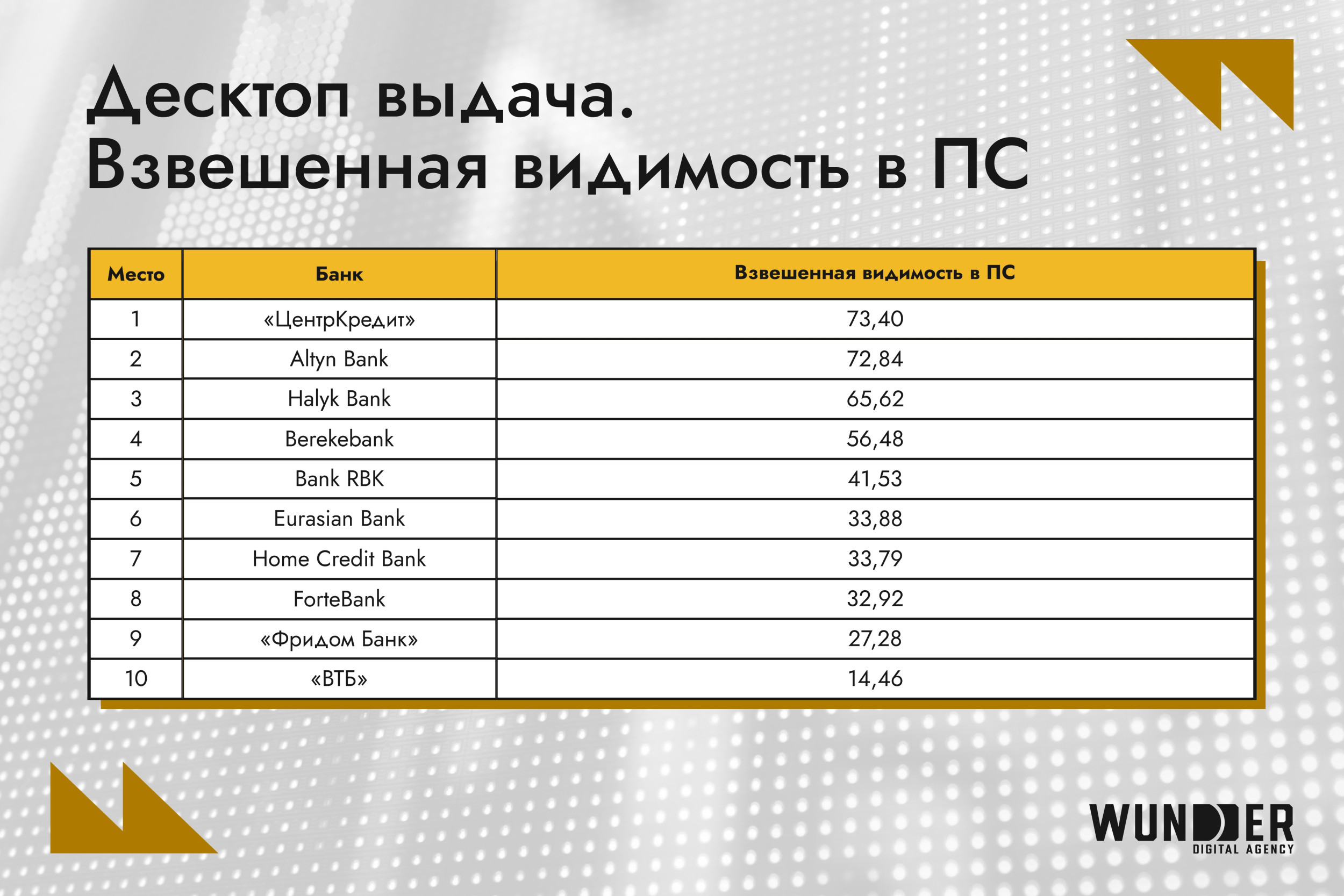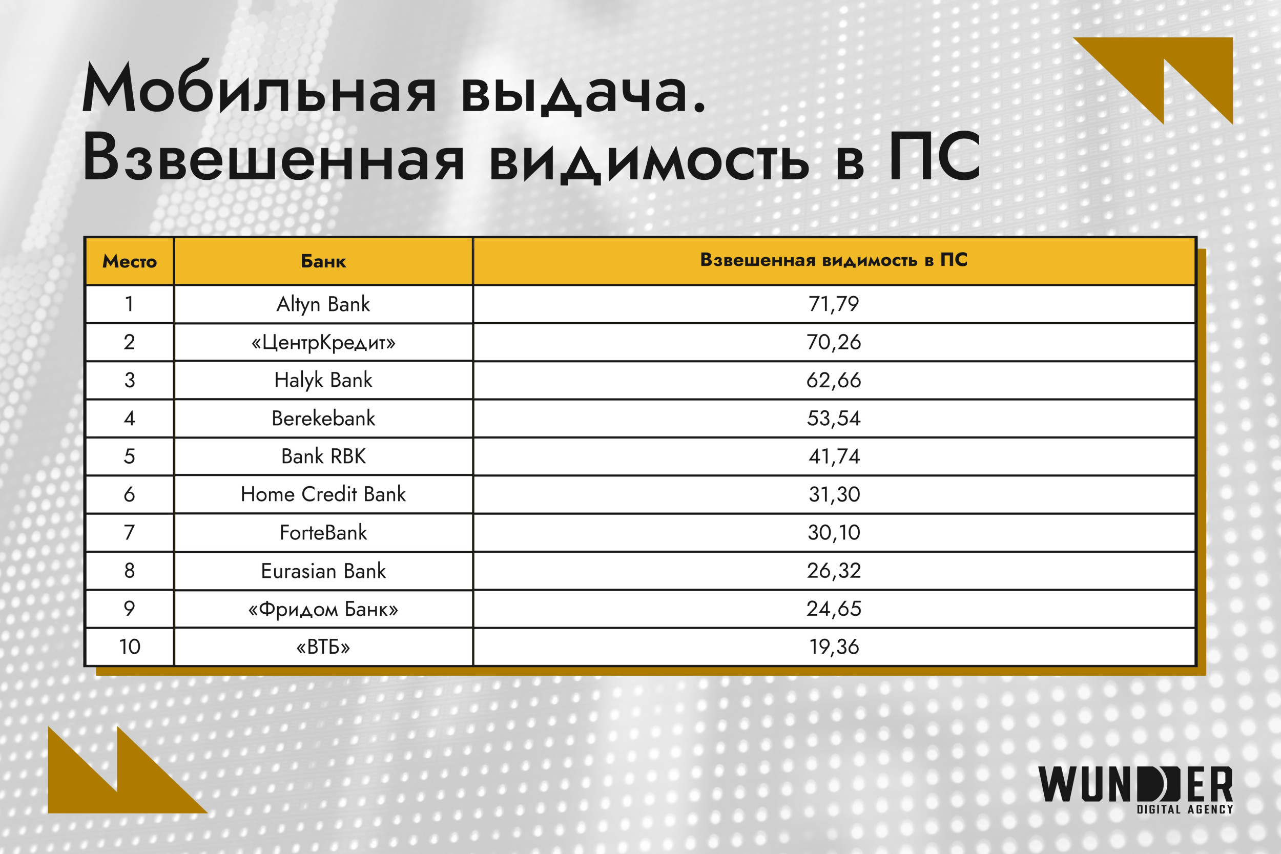 - Altyn Bank совершил рывок с четвертого места на первое, увеличив видимость на 12 п.п. Банк грамотно использовал мобильную оптимизацию и укрепил позиции.