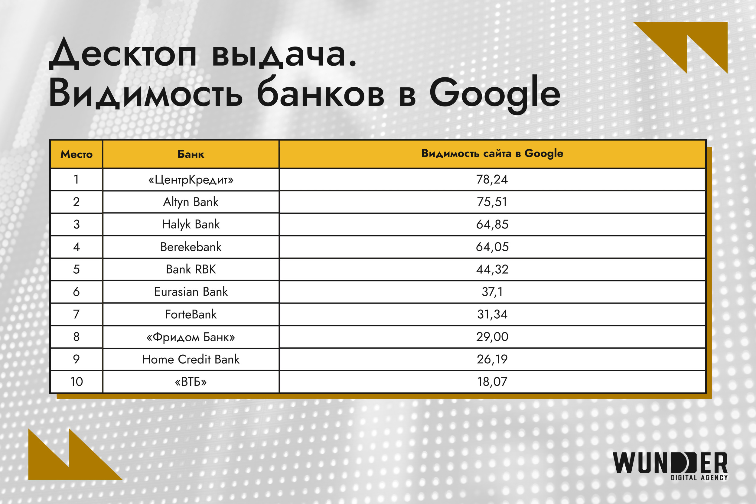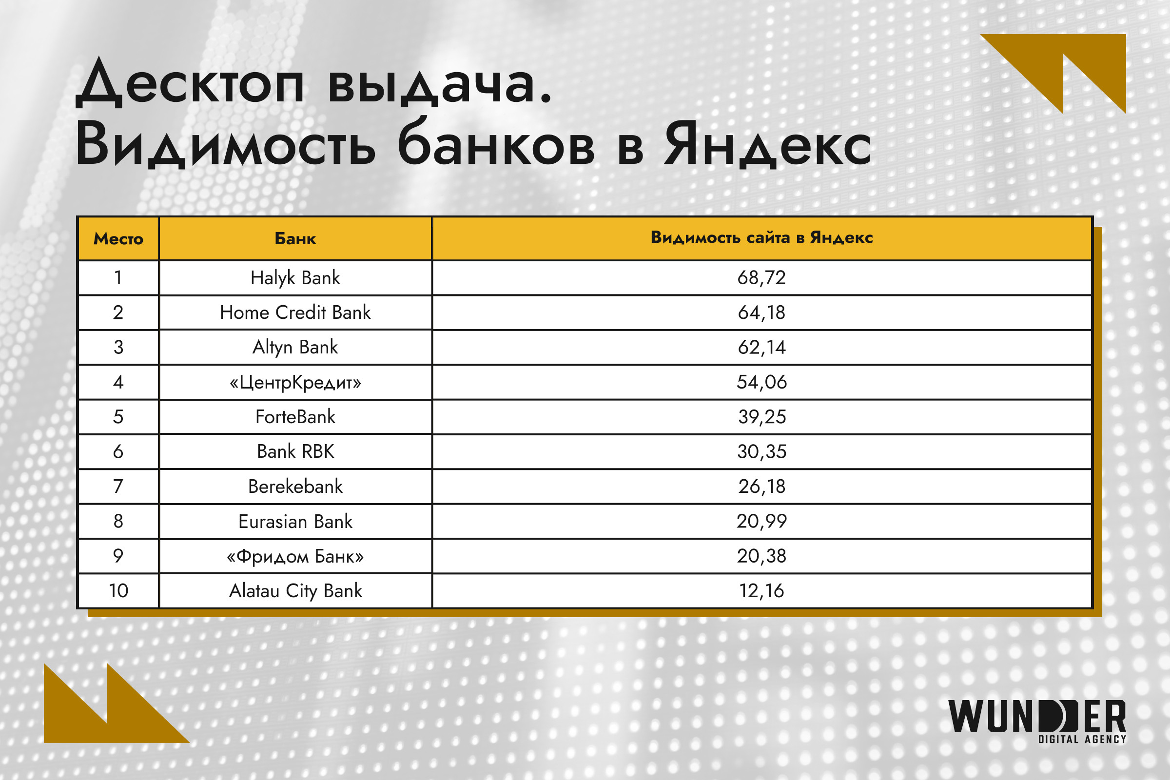 - Halyk Bank единственный в топ-3 демонстрирует более высокие позиции в Яндексе (68,72), чем в Google (64,85). При существующих весах это не позволяет ему подняться выше третьего места. Хотя его работа в Яндексе может быть эффективной для определенной аудитории.