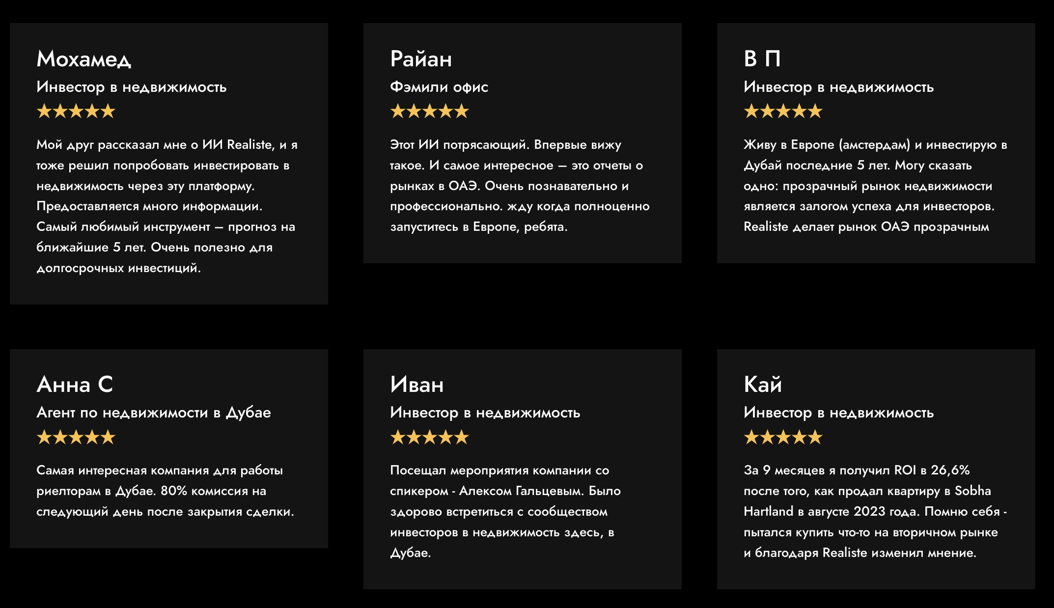 Realiste AI в Дубае изучает более 200 параметров перед тем, как предоставить пользователю выгодное инвестиционное предложение. Протестировать возможности и функционал Realiste ai можно бесплатно и без оформления подписки. Всего за несколько кликов удается полноценно проанализировать рынок недвижимости более чем в 100 городах и найти для себя выгодное решение. Пользователи, которые протестировали возможности и функционал платформы оставляют в основном только положительные отзывы о платформе Realiste.