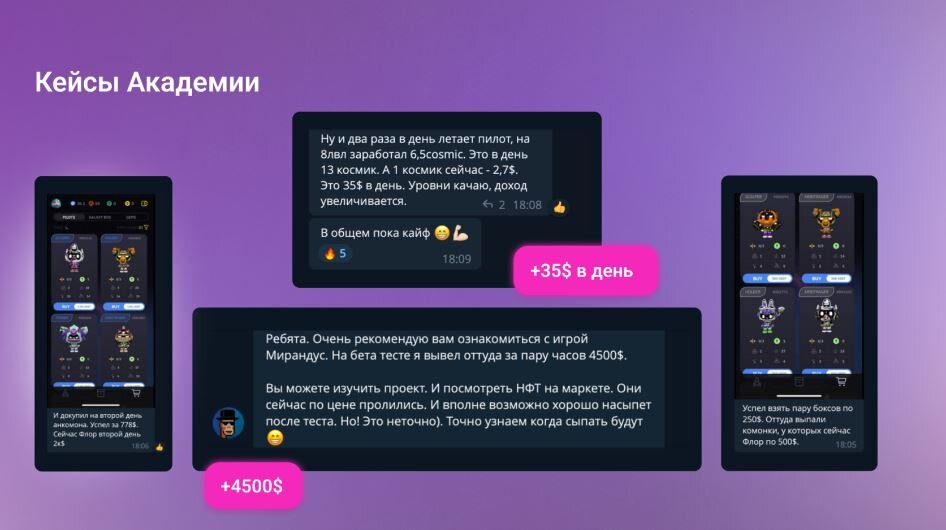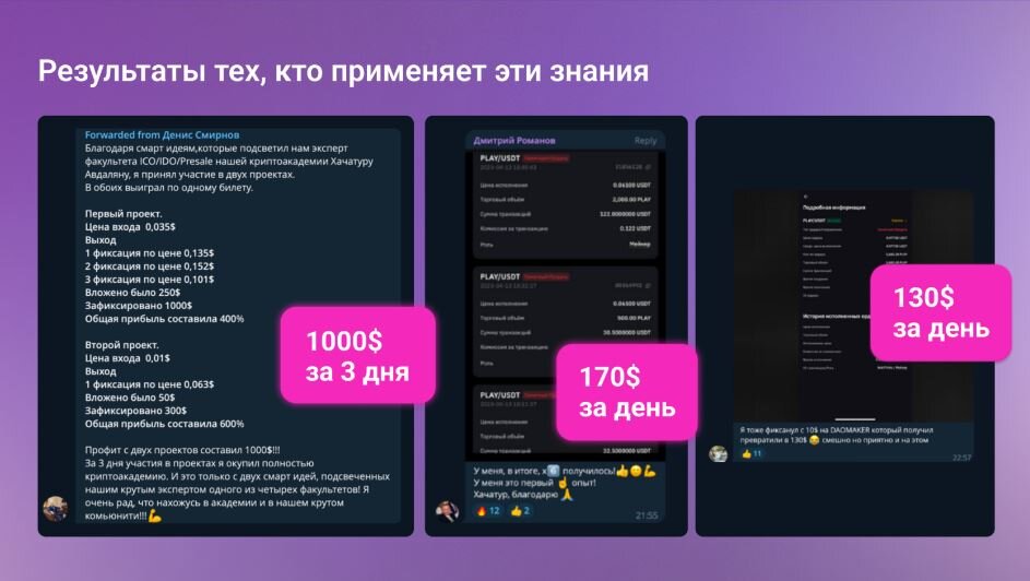 А чтобы увеличить шанс выигрыша в каждом проекте, мы увеличиваем количество аккаунтов, с которых принимаем участие. Все просто как дважды два, не занимает много времени и денег! Второе направление это криптотрейдинг Один из самых сложных и рисковых видов заработка. Почему? Потому что рынок очень волатилен, на него влияют и новости, и мировая ситуация, и политика, и все что хочешь. Но при этом в этой нише зарабатывают немалые деньги. Суть проста, если ты просчитал рынок правильно и предполагаешь подъем или просадку рынка, то можешь за пару часов сделать от своего бюджета процентов 50-100 легко. Главное не ошибиться) Если располагаешь бюджетом хотя бы в 100+ тысяч рублей и временем на изучение графиков, то смело можно заходить в это направление и зарабатывать в месяц 100% от своего капитала. Лично я просто балуюсь этим инструментом. Сильно не зарабатываю, потому что риск не маленький. Третье направление это Play To Earn — играй, чтобы заработать Во-первых это весь сектор метавселенных и игровой индустрии, в том числе NFT. Здесь можно вкладываться в токены компаний, которые собираются запустить крутую игру и потом, когда игра увидит свет, их токен (цифровая акция) вырастет в цене кратно. Также здесь можно покупать персонажей игр в виде NFT, либо целые участки земли. В общем индустрия огромная зарабатывай — не хочу) Плюсом можно зарабатывать в самой игре, то есть играешь, выполняешь квесты получаешь крипту на свой кошелек. Для любителей позалипать в игры — самое то! Лично, я в свободное время так развлекаюсь, на пользу своему кошельку) Четвертое направление это сектор DeFi, то есть децентрализованные финансы В сущности это не активный способ заработка, это больше про долгосрочные инвестиции. По сути это сектор заменяющий централизованные финансы — банки. Зачем я его использую? Чтобы те деньги которые я зарабатываю в крипте, не лежали мертвым грузом на кошельках, а работали и приносили мне доходность. Кстати если сравнить с банками, то здесь мы видим процентные ставки по пулам от 20 — 250% годовых. Согласитесь гораздо приятнее нежели вклад в банке?! А главное это, то что наши деньги защищены смарт контрактом, в котором прописаны все условия работы наших денег. Здесь не бывает банкротства банков, а значит и риски куда меньше. Если следить за всеми новостями и проектами в этих 4-х направлениях вы сможете реально заработать на новую квартиру в Москве всего за год! В этом уже убедились сотни и даже тысячи пользователей криптоиндустрии. У меня есть для вас еще один бонус! Я подготовил Онлайн практикум по безопасным и профитным инвестициям в мире крипты. Желаете создать новый источник дохода в крипте и зарабатывать в онлайне?Скорее проходите практикум! Так как практикум я даю СОВЕРШЕННО БЕСПЛАТНО у меня есть просьба, необходимо подписаться на мой телеграм канал: https://t.me/+bsAQqm_3sV85MzYy