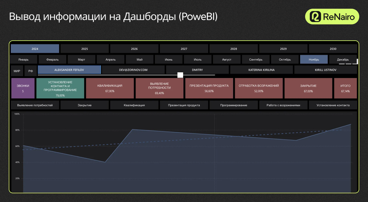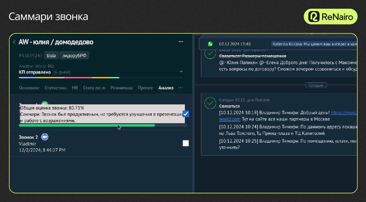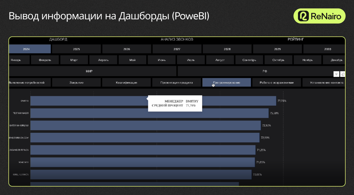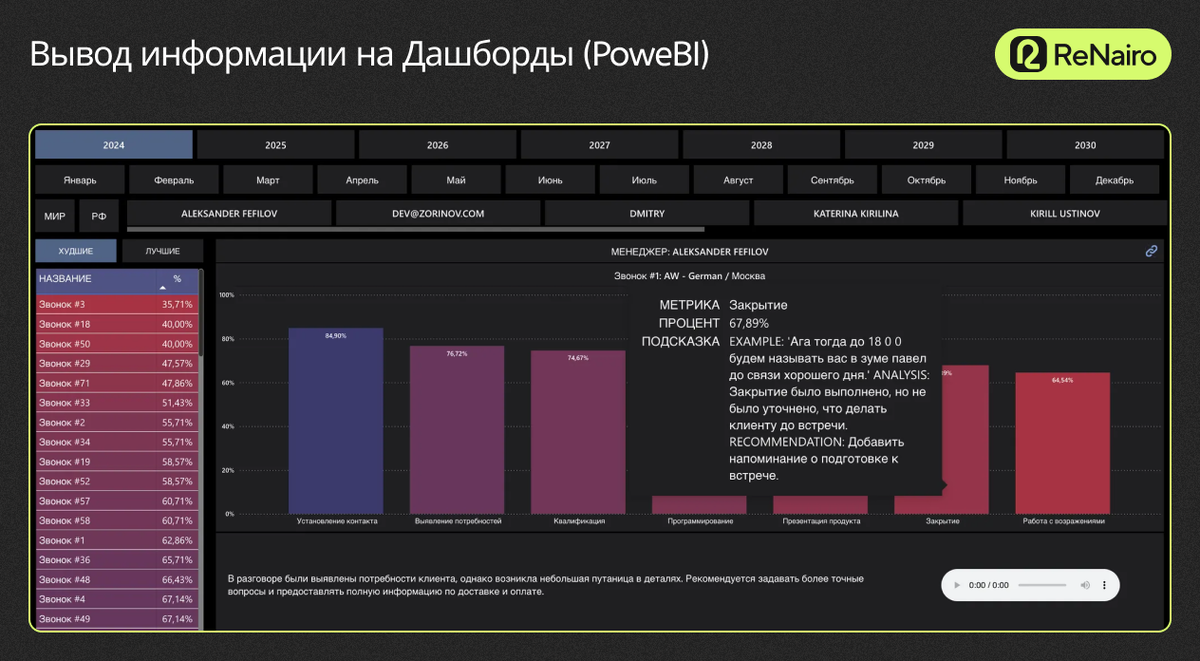 Когда мы добавляем нашу аналитику, появляется дополнительная вкладка, в которой подгружаются все звонки, которые есть в этой карточке. Это как телефонные звонки, так и Zoom-звонки. Теперь мы можем выбрать звонок, который будем анализировать по нажатию кнопки. После того, как анализ совершился (на это уходит полминуты/минута), мы получаем отображение о том, что звонок про анализировался. Теперь у нас есть краткая оценка summary, чтобы менеджер мог сразу же понять, насколько звонок был качественным и получить первую обратную связь по этому звонку. Что же происходит, когда мы выбрали звонок? Он идёт на транскрибацию. Сначала аудио переводится в текст и далее разбивается по спикерам, то есть по людям, которые говорили, чтобы нейронка чётко понимала, кто что говорил в диалоге. Далее, самый интересный этап — это анализ. Как происходит анализ? Он происходит по нескольким этапам. У нас есть скрипт продаж. Например, какие этапы вообще есть в скрипте продаж? Это установление контакта, программирование, презентация продукта и так далее. Установка контакта. Какие есть чек-листы внутри этого этапа? Например, спросил, как зовут человека, сам представился, спросил, удобно ли разговаривать, поприветствовал. В каждом этапе продажи есть свой чек-лист, который мы прописываем. Что делает нейронка? Она анализирует каждый пункт чек-листа, а также сам этап в целом. То есть, нейронка анализирует звонок, как человек поприветствовал корректно или с ошибками, с какой интонацией и так далее. После она анализирует весь чек-лист и оценивает полученный результат. Она дает оценку этому этапу и подпись summary, чтобы мы могли потом видеть это на дашбордах. Что мы в итоге получили? Что аудио у нас перевелось в текст, про анализировалось и вывелось на дашборды. Мы создали отдельный личный кабинет с отчетами всех проанализированных звонков и их транскрибации в Дашбордах, которые можно видоизменять и настраивать под индивидуальные запросы. Функционал дашборда. Можно выбрать год/месяц/день, менеджера для просмотра динамики и качества звонков в выбранном периоде/сотруднике. Также видны итоговые оценки по этапам всех продаж и по всем звонкам за этот месяц. Мы можем углубиться в каждый звонок, посмотреть, где именно была ошибка. Какой месяц был продуктивный, а какой не очень, где много слабых мест, особенно отработка возражений. Фильтр звонков. Мы можем открыть анализ звонков и отфильтровать звонки от лучших к худшему. Это нужно для того, чтобы не анализировать и не просматривать звонки, у которых высокая оценка (85% и выше). Это хорошие звонки, с минимальным количеством ошибок. Что мы можем сделать? Мы можем посмотреть по конкретному звонку, какие были недочеты. По нашим чек-листам и полученному анализу звонков, нейронка даст рекомендации: что конкретно было неверно в диалоге, какое нарушение отклонение от скрипта. Она откомментирует, почему дала такую оценку и дает рекомендации для дальнейшего усовершенствования. Для чего это все нужно? Мы можем быстро и удобно просмотреть summary и целый отчет, что в звонке было неверно. Плюс можно прослушать сам звонок, перейти по ссылке в сделку, легко перемещаясь в дашборде по всем сделкам/звонкам. Рейтинг менеджеров. Можно смотреть рейтинг менеджеров, кто как звонил, и получать рекомендации. А также делать рейтинг по разным метрикам: по установлени