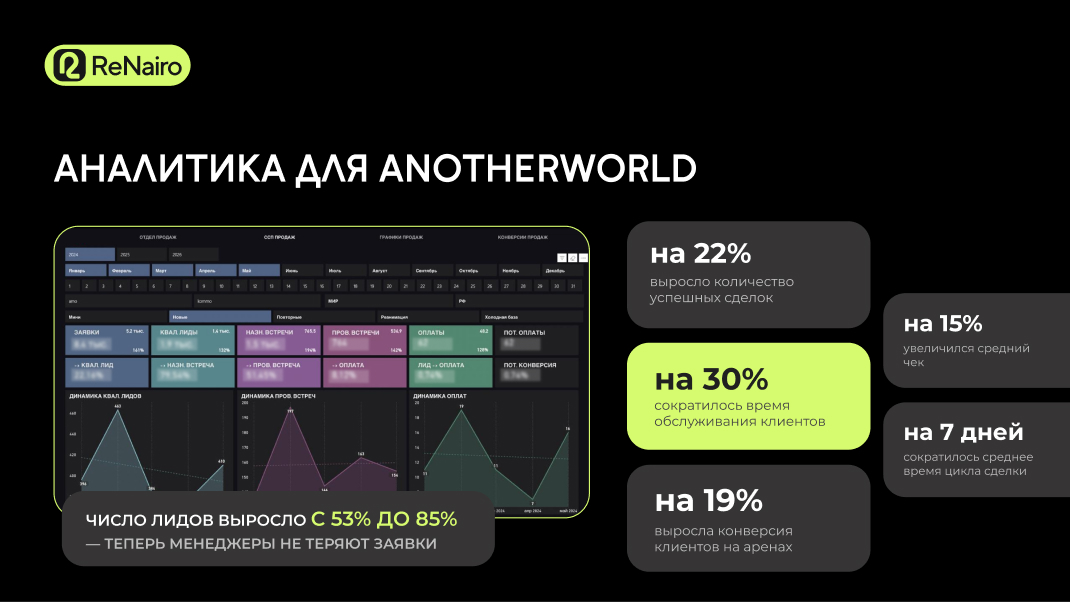 После внедрения комплексной системы аналитики в отделах продаж B2B и B2C компания AnotherWorld сразу заметила изменения в процессах работы и показателях. Менеджеры стали получать детальные рекомендации по каждой сделке, а рутинная работа с админами сократилась, что позволило сосредоточиться на закрытии продаж и взаимодействии с клиентами.