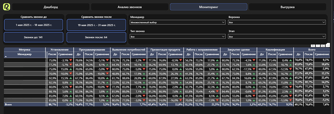 Решением стал ReNairo — инструмент, который анализирует звонки, выявляет ошибки и формирует понятные отчёты. Система автоматически подключилась к внутренней телефонии компании, собрала все разговоры в единый интерфейс и показала, как менеджеры ведут диалог с клиентом.