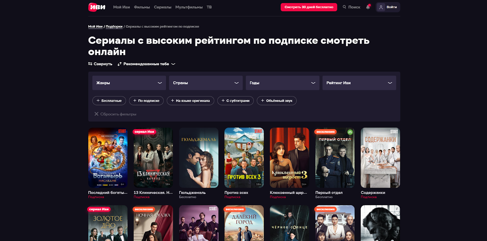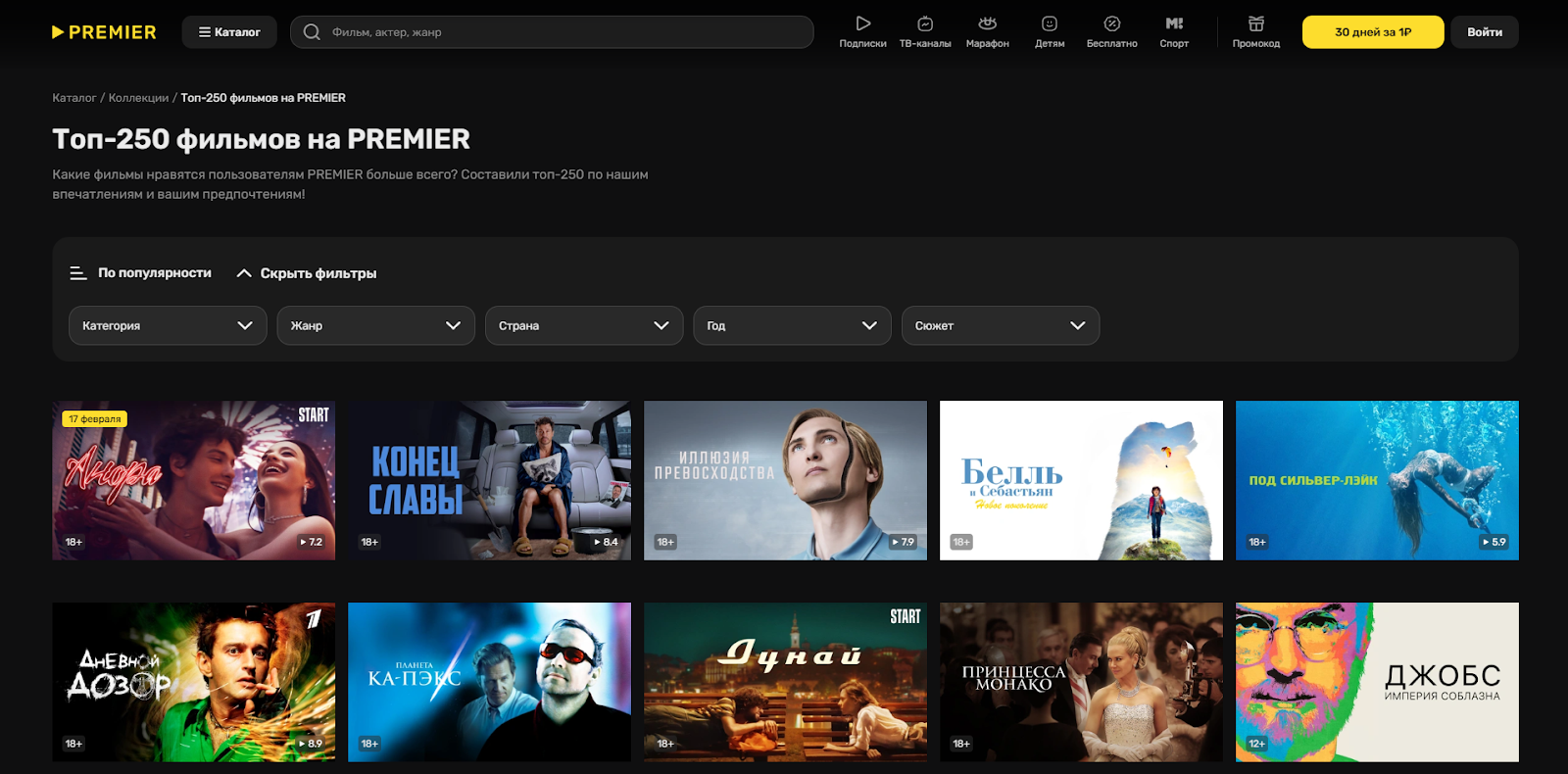В чем ключевая проблема листинга? Я зашел и хочу посмотреть фильм точно не российского производства с рейтингом от 7.5 баллов. Здесь я не могу применить никакой фильтрации, никакой сортировки (например, рейтинг по убыванию), не могу выбрать страну или какие-то определенные жанры.