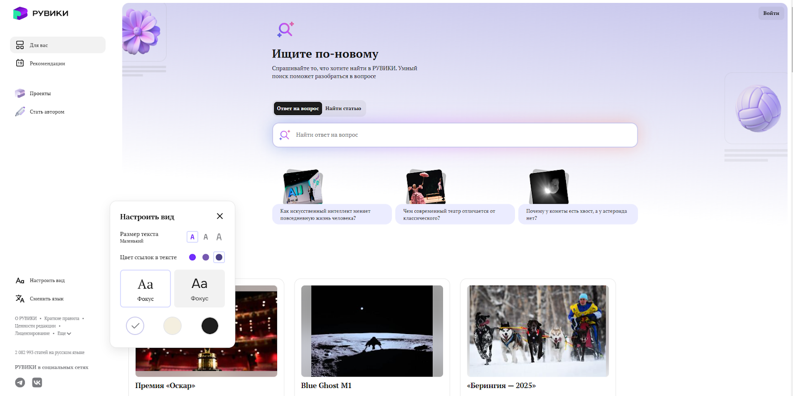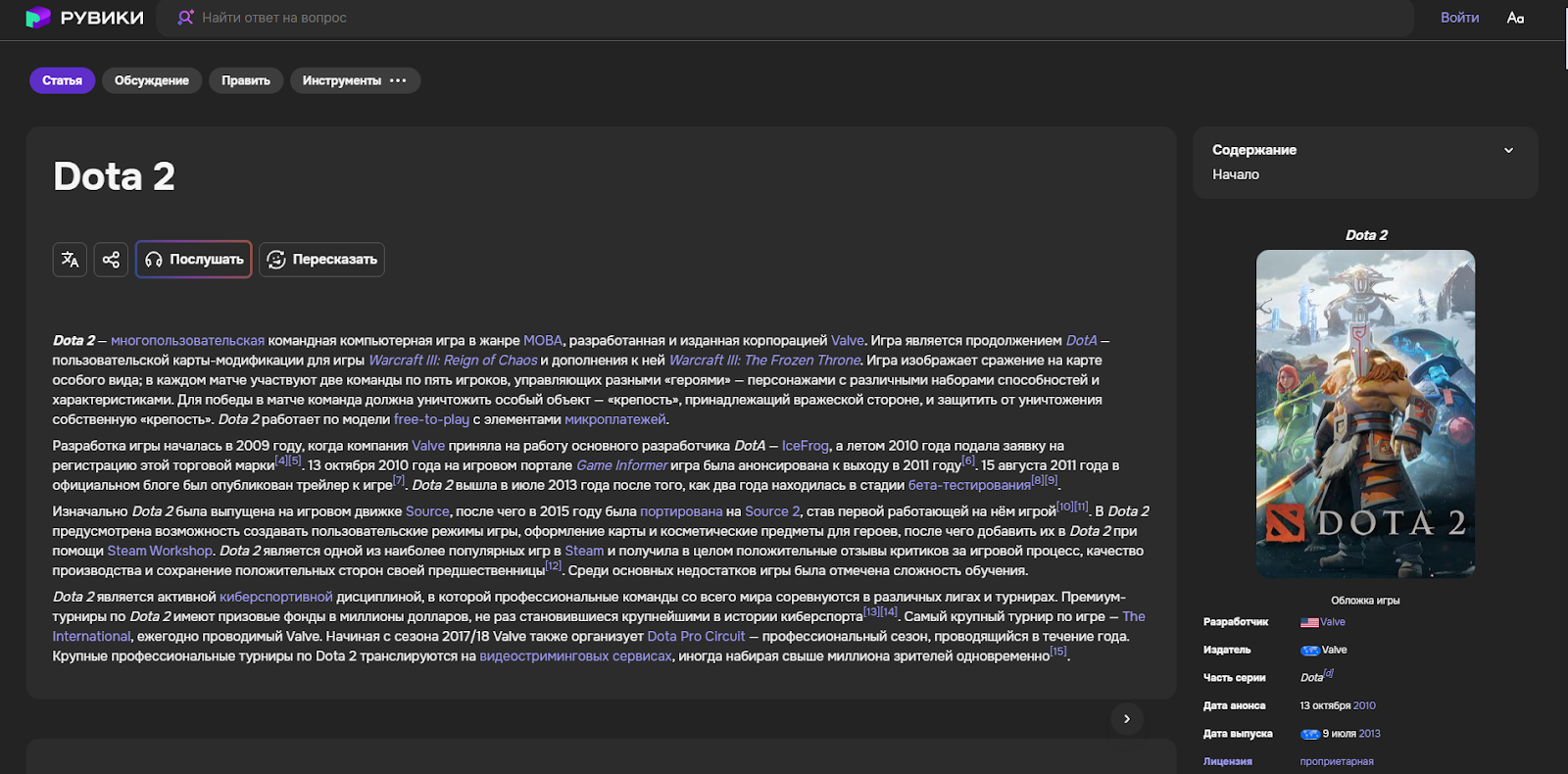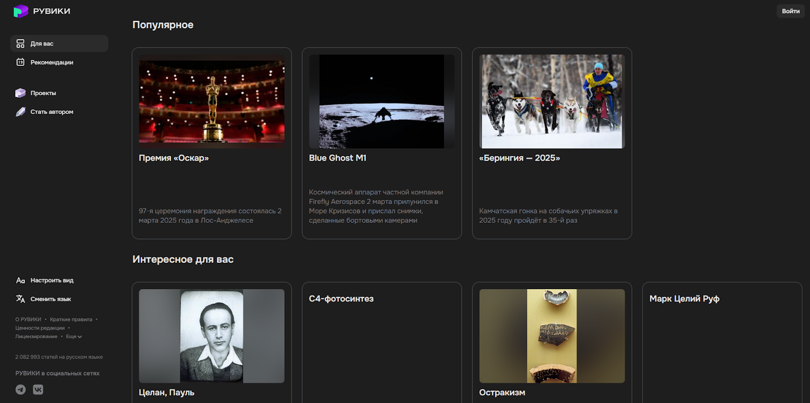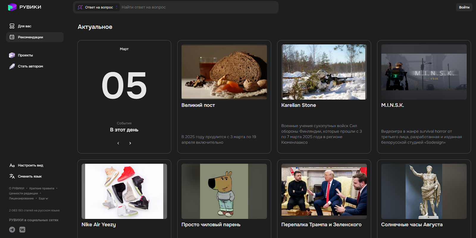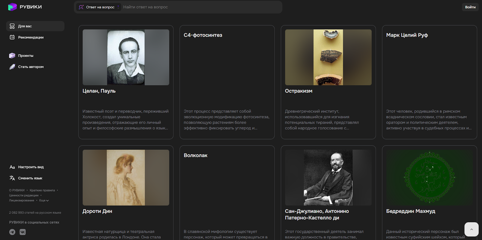 Рувики сходу встречает пользователей своей киллер-фичей в виде поиска при помощи искусственного интеллекта. С ИИ не все так просто — над поиском есть отдельный переключатель: Под поиском — три заранее подготовленных вопроса. При клике на один из них вас перекидывает в «диалог с ИИ», который, собственно и отвечает на вопрос. В левой части — выбор раздела (по умолчанию «для вас»), информация про проекты, так или иначе связанных с Рувики, возможность стать автором и настройки. Сейчас на сервисе доступен 21 язык — от русского до калмыцкого. А в настройках внешнего вида — переключатель темы, возможность менять размер текста, цвет ссылок в статьях и сам шрифт. Вот так, например, выглядит сервис в светлой теме, первым видом шрифта и маленьким размером текста: (дальше в статье будут скрины с темной темой, средним размером текста и вторым шрифтом) На ваш взгляд, насколько лучше/хуже выглядит сайт с темной темой? Напишите об этом в комментариях, а мы перейдем к главной странице Ру.Википедии. Стоит отдать должное Рувики — визуально наш аналог выглядит на несколько голов выше западного сервиса. Здесь слишком большой объем информации на главной может дезориентировать пользователя. С другой стороны, информация на главной Вики сразу делится по нескольким направлениям: И если вы зайдете на Вики с целью изучения именно что новой информации, то такой подход может смотивировать вас прочитать новую информацию. Первый скрол Рувики же скорее хочет смотивировать вас воспользоваться килер фичей с ИИ, а не узнать что-то новое. Важно: ни первый, ни второй экран я не считаю плохим с точки зрения подачи информации. Это просто разные подходы, нацеленные на разный конечный результат. Еще одним важным отличием главной являются вшитые ссылки. Они встретятся на Рувики дальше, но на Ру.Википедии вам с первых секунд заявляют: «У нас много информации, даже если она косвенна относится к теме. Поэтому, если тебе интересно, то нажми на синий текст и узнай больше». А так выглядит англоязычная Вики (на самом деле, не только англоязычная, многие Вики на разных языках уже перешли к такому дизайну): Поиск перенесли ближе к центральной части, дополнительные сервисы спрятали в «tools», а сами блоки стали меньше. В правой части экрана появилась настройка страницы — изменение размера текста, широты страницы и выбор светлой/темной темы. (маленький размер текста, широкий формат и темная тема — в будущем буду использовать именно её) По контентному наполнению изменились «карточки» — их стало больше, а информация стала подаваться в формате конспектов. В остальном же дизайн, как минимум, главной, не претерпел значительных изменений. И в отличие от Рувики, он все еще кажется устаревшим. Вернемся же к Рувики и спустимся чуть ниже: В очередной раз скажу об этом, но почему сервис, на который пользователь заходит впервые, предлагает мне статьи «интересное для вас»? Личное непонимание, ведь сервис обо мне либо ничего не знает, либо ворует информацию из «дружественных» порталов. И каждый раз мне кажется, что за мной следят, а мне бы этого очень не хотелось) Тем не менее, сами статьи на главной представлены в формате карточек. В самом начале представлены самые популярные статьи за выбранный период, ниже «персонализированные рекомендации». Не совсем понятно, по какому принципу строятся карточки. 