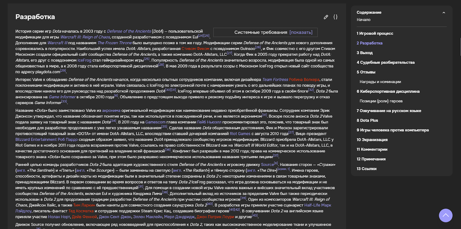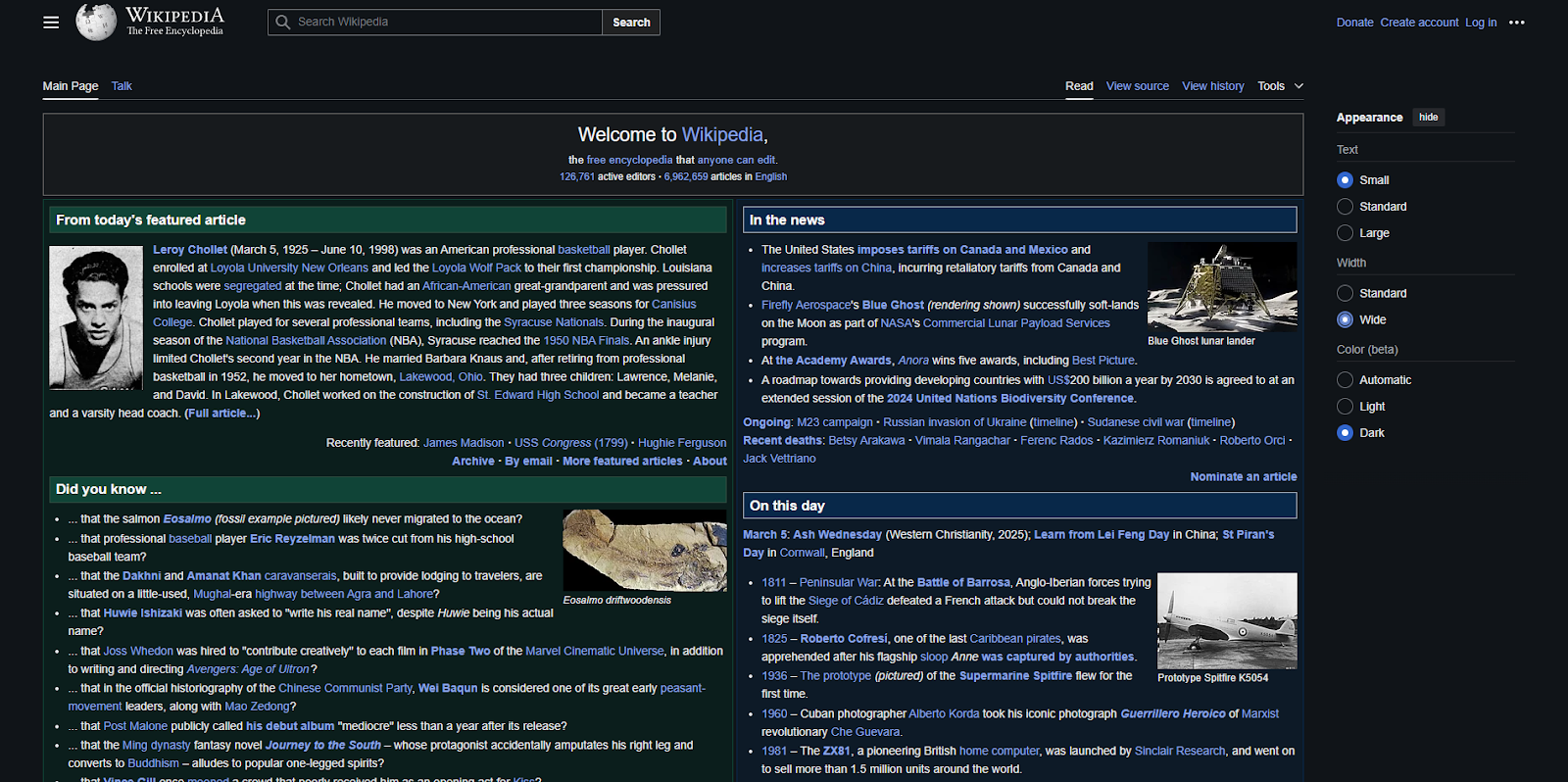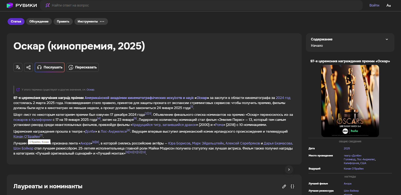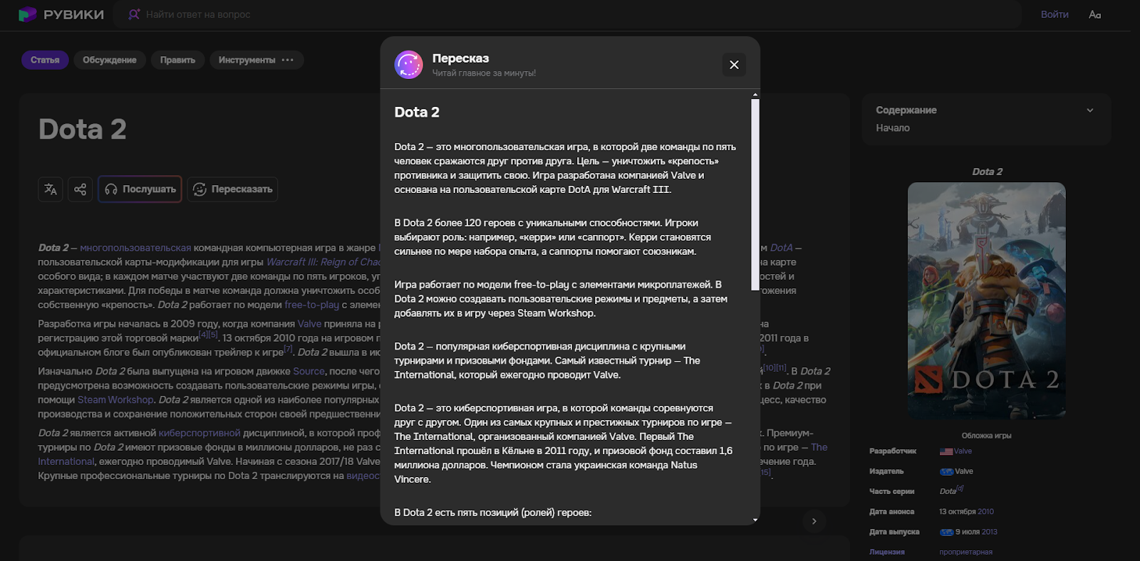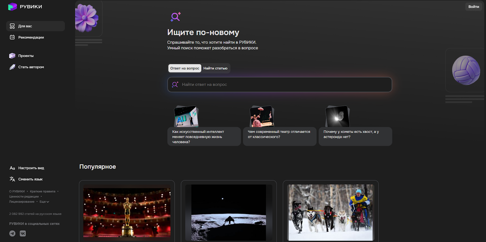 Рувики сходу встречает пользователей своей киллер-фичей в виде поиска при помощи искусственного интеллекта. С ИИ не все так просто — над поиском есть отдельный переключатель: Под поиском — три заранее подготовленных вопроса. При клике на один из них вас перекидывает в «диалог с ИИ», который, собственно и отвечает на вопрос. В левой части — выбор раздела (по умолчанию «для вас»), информация про проекты, так или иначе связанных с Рувики, возможность стать автором и настройки. Сейчас на сервисе доступен 21 язык — от русского до калмыцкого. А в настройках внешнего вида — переключатель темы, возможность менять размер текста, цвет ссылок в статьях и сам шрифт. Вот так, например, выглядит сервис в светлой теме, первым видом шрифта и маленьким размером текста: (дальше в статье будут скрины с темной темой, средним размером текста и вторым шрифтом) На ваш взгляд, насколько лучше/хуже выглядит сайт с темной темой? Напишите об этом в комментариях, а мы перейдем к главной странице Ру.Википедии. Стоит отдать должное Рувики — визуально наш аналог выглядит на несколько голов выше западного сервиса. Здесь слишком большой объем информации на главной может дезориентировать пользователя. С другой стороны, информация на главной Вики сразу делится по нескольким направлениям: И если вы зайдете на Вики с целью изучения именно что новой информации, то такой подход может смотивировать вас прочитать новую информацию. Первый скрол Рувики же скорее хочет смотивировать вас воспользоваться килер фичей с ИИ, а не узнать что-то новое. Важно: ни первый, ни второй экран я не считаю плохим с точки зрения подачи информации. Это просто разные подходы, нацеленные на разный конечный результат. Еще одним важным отличием главной являются вшитые ссылки. Они встретятся на Рувики дальше, но на Ру.Википедии вам с первых секунд заявляют: «У нас много информации, даже если она косвенна относится к теме. Поэтому, если тебе интересно, то нажми на синий текст и узнай больше». А так выглядит англоязычная Вики (на самом деле, не только англоязычная, многие Вики на разных языках уже перешли к такому дизайну): Поиск перенесли ближе к центральной части, дополнительные сервисы спрятали в «tools», а сами блоки стали меньше. В правой части экрана появилась настройка страницы — изменение размера текста, широты страницы и выбор светлой/темной темы. (маленький размер текста, широкий формат и темная тема — в будущем буду использовать именно её) По контентному наполнению изменились «карточки» — их стало больше, а информация стала подаваться в формате конспектов. В остальном же дизайн, как минимум, главной, не претерпел значительных изменений. И в отличие от Рувики, он все еще кажется устаревшим. Вернемся же к Рувики и спустимся чуть ниже: В очередной раз скажу об этом, но почему сервис, на который пользователь заходит впервые, предлагает мне статьи «интересное для вас»? Личное непонимание, ведь сервис обо мне либо ничего не знает, либо ворует информацию из «дружественных» порталов. И каждый раз мне кажется, что за мной следят, а мне бы этого очень не хотелось) Тем не менее, сами статьи на главной представлены в формате карточек. В самом начале представлены самые популярные статьи за выбранный период, ниже «персонализированные рекомендации». Не совсем понятно, по какому принципу строятся карточки. 