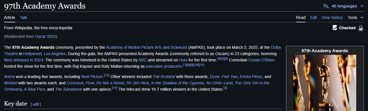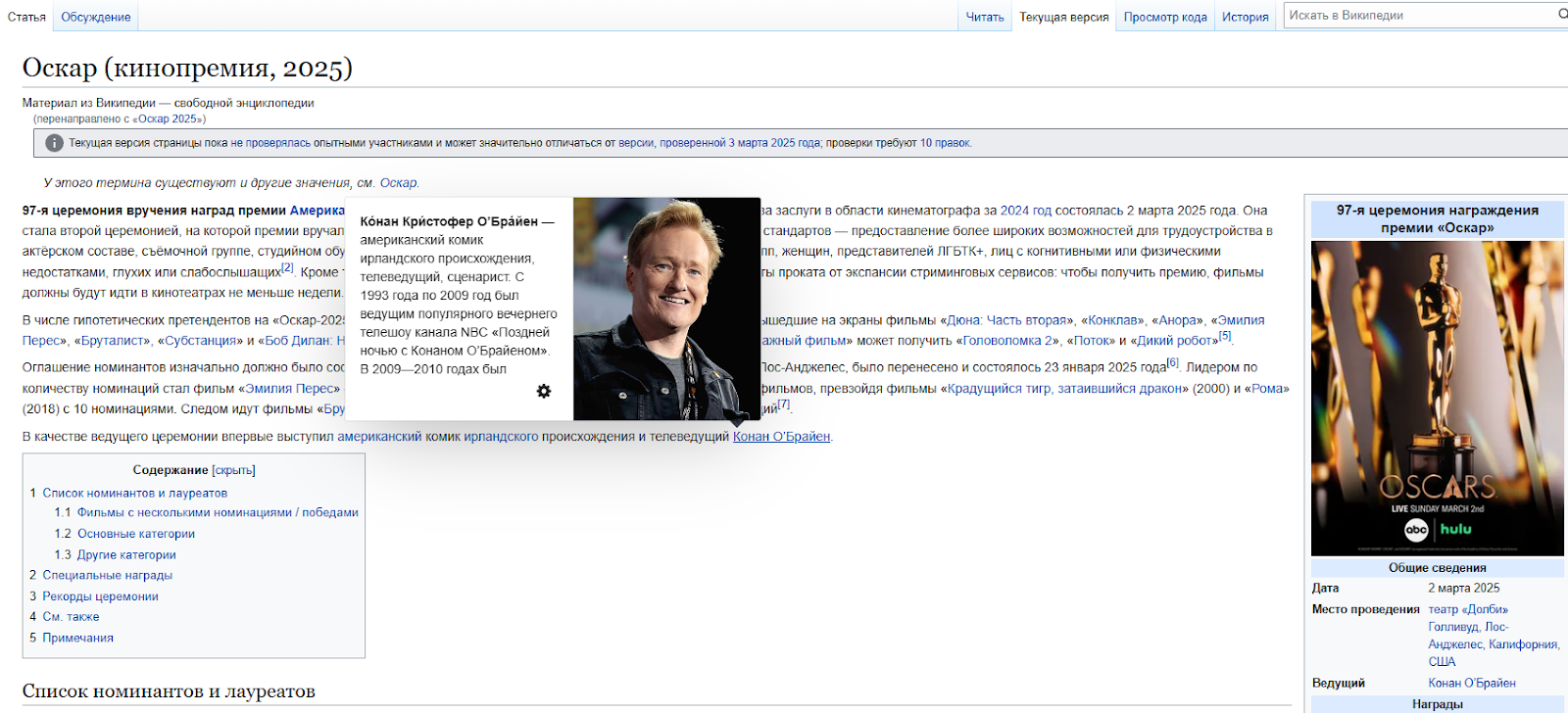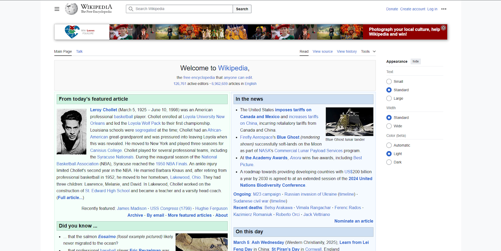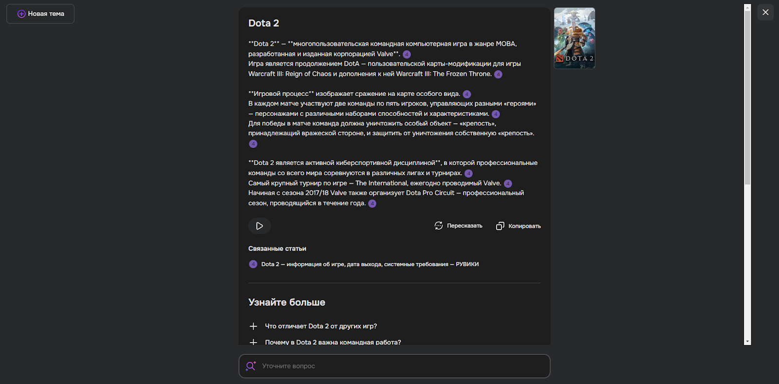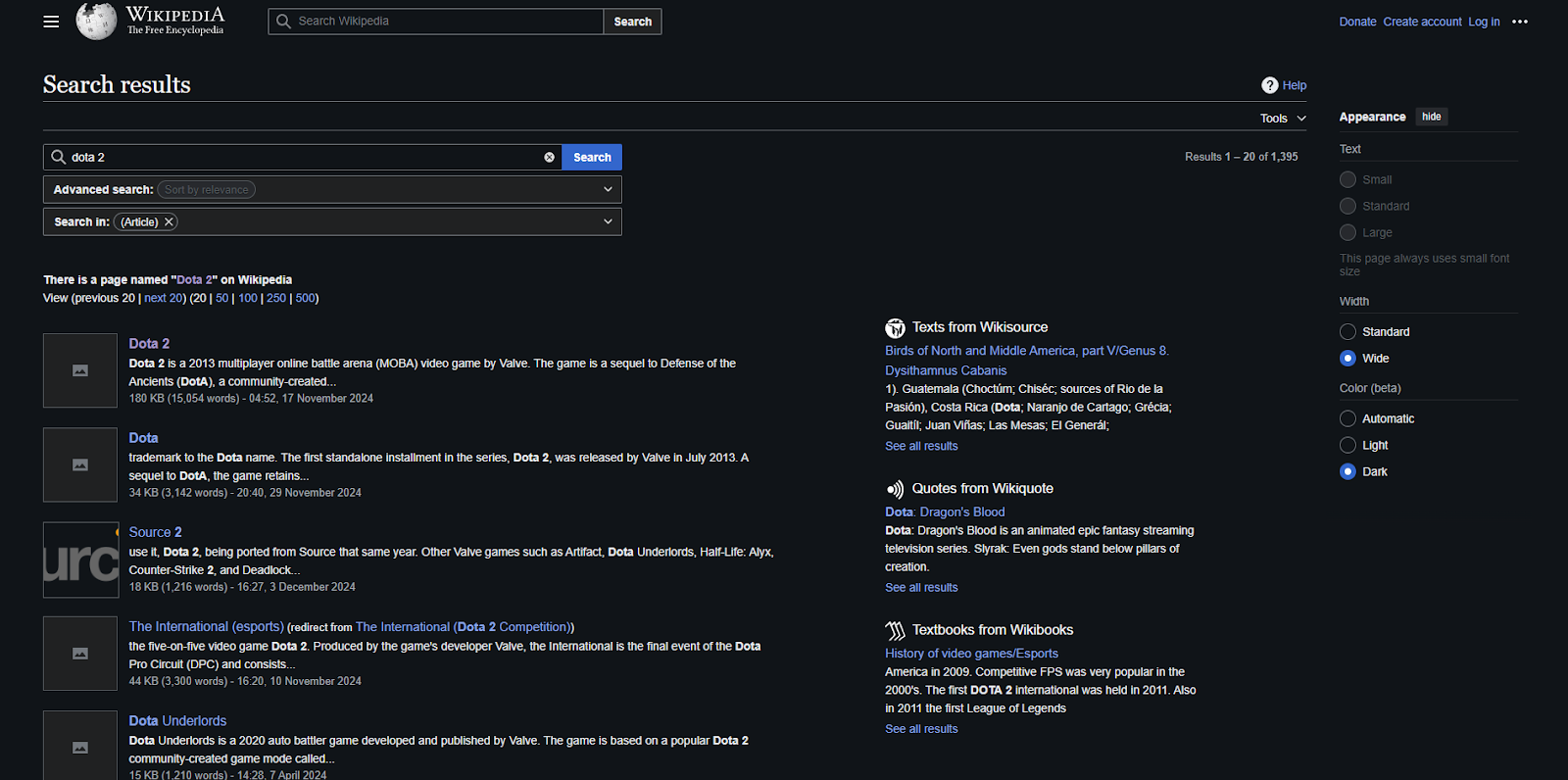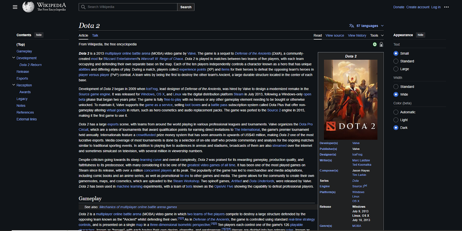 Рувики сходу встречает пользователей своей киллер-фичей в виде поиска при помощи искусственного интеллекта. С ИИ не все так просто — над поиском есть отдельный переключатель: Под поиском — три заранее подготовленных вопроса. При клике на один из них вас перекидывает в «диалог с ИИ», который, собственно и отвечает на вопрос. В левой части — выбор раздела (по умолчанию «для вас»), информация про проекты, так или иначе связанных с Рувики, возможность стать автором и настройки. Сейчас на сервисе доступен 21 язык — от русского до калмыцкого. А в настройках внешнего вида — переключатель темы, возможность менять размер текста, цвет ссылок в статьях и сам шрифт. Вот так, например, выглядит сервис в светлой теме, первым видом шрифта и маленьким размером текста: (дальше в статье будут скрины с темной темой, средним размером текста и вторым шрифтом) На ваш взгляд, насколько лучше/хуже выглядит сайт с темной темой? Напишите об этом в комментариях, а мы перейдем к главной странице Ру.Википедии. Стоит отдать должное Рувики — визуально наш аналог выглядит на несколько голов выше западного сервиса. Здесь слишком большой объем информации на главной может дезориентировать пользователя. С другой стороны, информация на главной Вики сразу делится по нескольким направлениям: И если вы зайдете на Вики с целью изучения именно что новой информации, то такой подход может смотивировать вас прочитать новую информацию. Первый скрол Рувики же скорее хочет смотивировать вас воспользоваться килер фичей с ИИ, а не узнать что-то новое. Важно: ни первый, ни второй экран я не считаю плохим с точки зрения подачи информации. Это просто разные подходы, нацеленные на разный конечный результат. Еще одним важным отличием главной являются вшитые ссылки. Они встретятся на Рувики дальше, но на Ру.Википедии вам с первых секунд заявляют: «У нас много информации, даже если она косвенна относится к теме. Поэтому, если тебе интересно, то нажми на синий текст и узнай больше». А так выглядит англоязычная Вики (на самом деле, не только англоязычная, многие Вики на разных языках уже перешли к такому дизайну): Поиск перенесли ближе к центральной части, дополнительные сервисы спрятали в «tools», а сами блоки стали меньше. В правой части экрана появилась настройка страницы — изменение размера текста, широты страницы и выбор светлой/темной темы. (маленький размер текста, широкий формат и темная тема — в будущем буду использовать именно её) По контентному наполнению изменились «карточки» — их стало больше, а информация стала подаваться в формате конспектов. В остальном же дизайн, как минимум, главной, не претерпел значительных изменений. И в отличие от Рувики, он все еще кажется устаревшим. Вернемся же к Рувики и спустимся чуть ниже: В очередной раз скажу об этом, но почему сервис, на который пользователь заходит впервые, предлагает мне статьи «интересное для вас»? Личное непонимание, ведь сервис обо мне либо ничего не знает, либо ворует информацию из «дружественных» порталов. И каждый раз мне кажется, что за мной следят, а мне бы этого очень не хотелось) Тем не менее, сами статьи на главной представлены в формате карточек. В самом начале представлены самые популярные статьи за выбранный период, ниже «персонализированные рекомендации». Не совсем понятно, по какому принципу строятся карточки. 