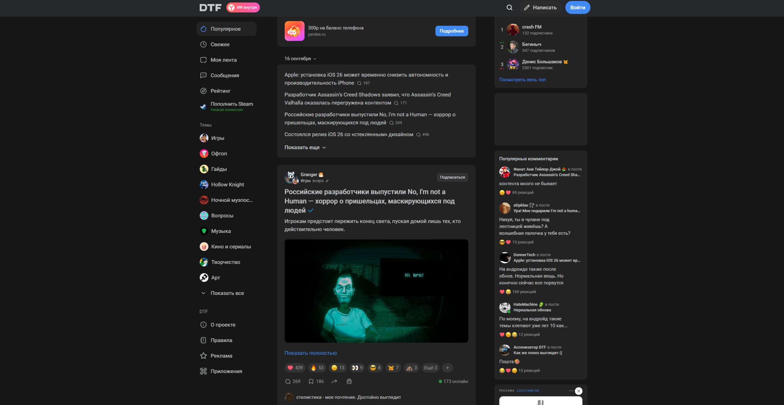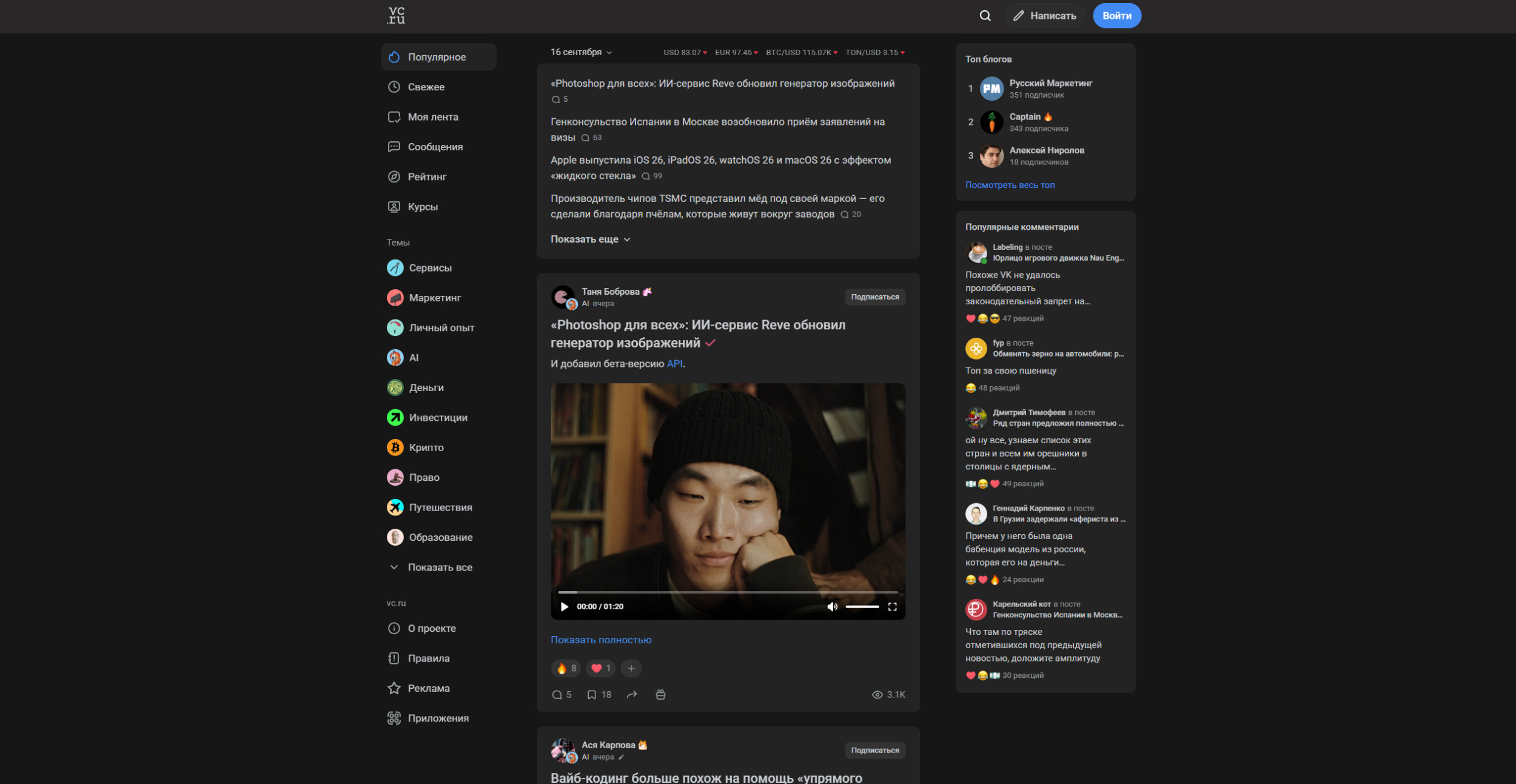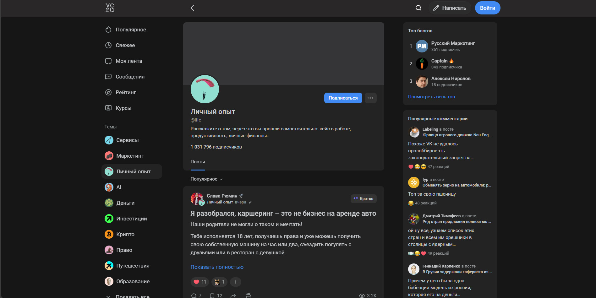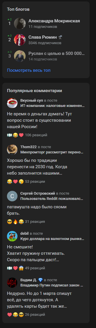 Популярные блоги — чтоб ты мог перейти почитать, доп точка входа + получить мотивацию что-то самому написать, как и с комментами