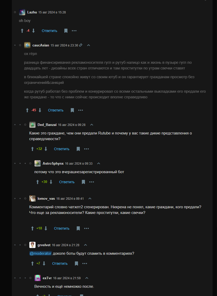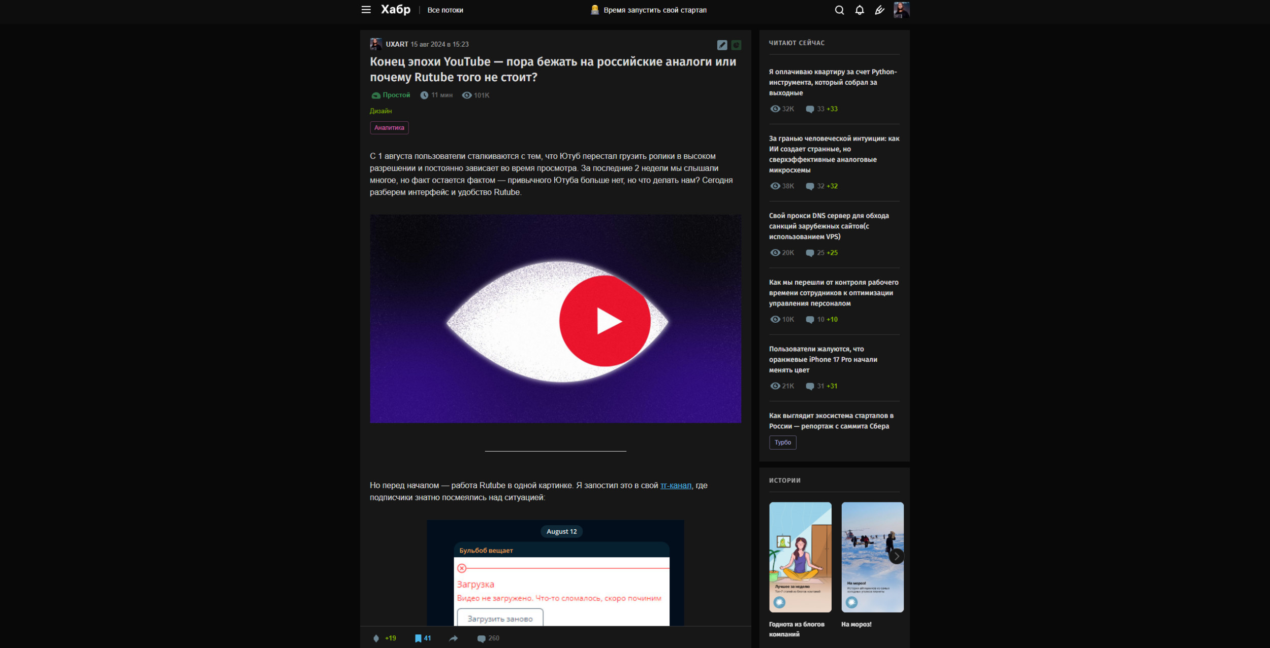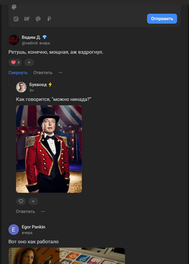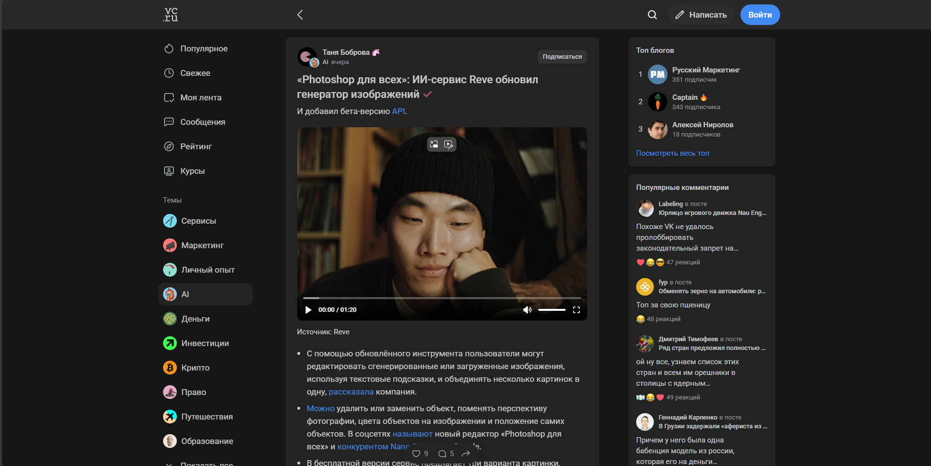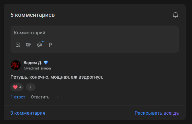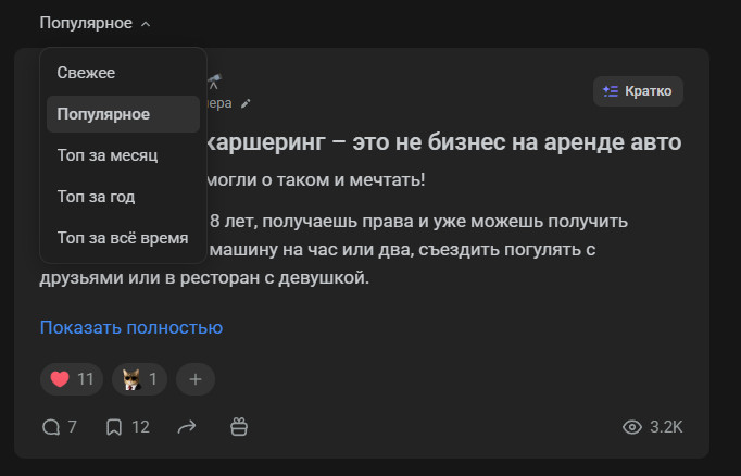 Когда я впервые зашел на VC то словил эффект дежавю. Ведь где-то, когда-то, почему-то я уже знал, как именно выглядит этот сайт и как он работает. И в действительности оказалось, что есть сайт, который выглядит один в один. И имя ему — DTF. В целом, если убрать лого и скрыть «темы», то вы легко перепутаете сайты. И если погуглить, то выяснится, что в 2016 году Издательский дом «Комитет» выкупает DTF и включает его в свой холдинг. В нем же находится VC.ru и TJournal. В целом, это не так важно в контексте разбора самого сервиса, но не упомянуть это (в каком-то смысле) историческое событие блогинга я не мог. Зачем мне видеть топ среди всех блогов, если я впервые зашел на сервис. И зачем мне видеть популярные комментарии. Все-таки, в первую очередь (именно я, а так как разбор имеет субъективность, то вы часто увидите подобные высказывания) я захожу прочитать статьи, а не посмотреть на топы. А вот как на мой тезис отреагировал наш CEO — Артем Конаков: В остальном же, все приятно и хочется сразу прокликать статьи. Но давайте для начала посмотрим на «карточку» Из плюсов карточки на VC — возможность сразу на главной прочитать саму статью. В таком случае отключится функционал комментариев, но это не помешает вам прочитать материал. Также приятно видеть видео в обложках (это вообще эксклюзив среди трех рассматриваемых сегодня площадок) Из нейтрального — теперь VC галочкой показывает статьи редакции. Это небольшое отличие от остальных платформ, но странным это становится в моменте «топов» статей. Ведь из-за последних решений владельцев площадки, многие студии и блогеры с VC ушли. А из этого следует, что в «популярном» теперь много материалов редакции, а не пользователей. Из минусов — чтобы перейти на статью нужно кликнуть именно на заголовок. Если кликнуть на фото, то оно увеличится. Если на видео — поставится на паузу/снимется с неё. На остальные элементы — произойдут точечные взаимодействия. «Глазик» покажет чуть больше инфы по просмотрам, а реакции — неудивительно, поставят реакцию. Словно было бы гораздо удобнее переходить на статью по клику на карточку, а не стараться целиться в заголовок. Перейдя на страницу статьи добавляется лишь плашка снизу с показом лайков/комментов/репостов в режиме реального времени. Сами статьи разберем во втором сценарии, т.к. это лучше раскроет «функционал» редактора. Тут лишь могу сказать, что на VC действительно удобно читать. Текст не занимает все экранное место, отчего ты не успеваешь «перескакивать» с абзаца на абзац. Но, естественно, это во многом зависит от самого автора. Некоторые ведь пишут полотна без разделения, как, например, я в этом примере. А, кстати, вы знали, что до невозможности тяжело читать предложения, разделенные на множество запятых без завершения мысли в рамках одного длинного предложения. Не делайте так)0 С комментариями у VC отдельная интересная история. По какой-то причине для «раскрытия всегда» нужно платить деньги. Если же вы не хотите этого делать, то нужно нажать на кнопку слева. С точки зрения бизнеса возможно это и хороший ход. Ведь это «один из плюсов» подписки. Но чисто как пользователь я этого как не понимал 3 года назад, так и не понимаю сейчас. Тем не менее сами комментарии делятся на «ветки», что весьма удобно (привет, VK Видео). По самому взаимодействию — вы можете поставить реакт, ответить текстово, отправи