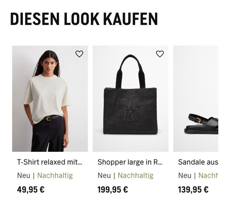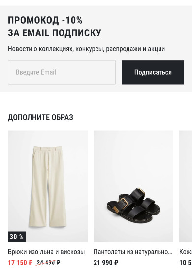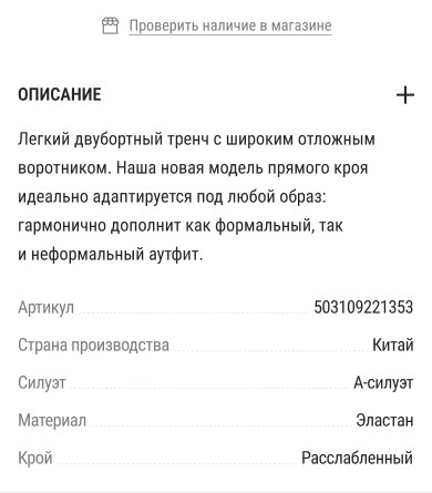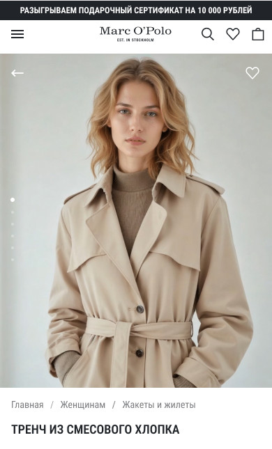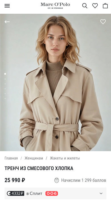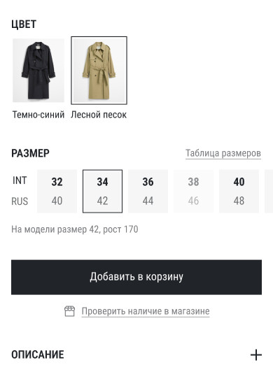 Неэффективная шапка Шапку стоит сделать компактной и функциональной (с меню/поиском), убрать баннер о скидке и показывать можно при скролле вверх. Что можно улучшить с фото Как мы это изменили: Сделали акцент на «вау-эффекте», который подкрепляется видео в начале и большим количеством визуалов одежды в целом. Баннер со скидками оставили, сделав его «органичнее» под цветовую палитру сайта, а хлебные крошки сократили, переместив под видео/фотографии. Старая навигация имела еще один минус — пользователь встречался с непривычным паттерном «перехода на прошлый раздел». На нашем концепте мы поставили «стрелку влево» в привычную позицию «верхний левый угол». На старой версии переход назад располагался под заголовком. Описание товара в самом начале карточки Текст неинформативный и находится сразу под фото, это важная зона внимания. Пользователю важно быстро понять, какие опции есть, подходит ли ему товар, вместо этого он получает текст, который не даёт никакой конкретики и не прибавляют ценности товару. Лучше убрать описание и сделать акцент на фотографиях, а место, которое он занимает отвести под размерную сетку и выбор цвета Одновременно показаны две размерные сетки Видно, что описание товаров вдохновлялось описанием дуба у Льва Николаевича. Оно огромное и низка вероятность того, что пользователь готов читать эту стену текста. Лучше сократить его, а ключевые моменты вынести отдельно. Параметры модели Лучше поднять этот блок максимально близко к выбору размера и размерной сетки, т.к. это связанная информация. Сейчас, чтобы определиться с размером, пользователь вынужден листать далеко вниз и потом возвращаться наверх, чтобы выбрать размер. Добавить блок наличия в магазине (его нет) Нет предложенных других товаров Стоит добавить блок «Похожие товары» или «С этим товаром покупают» Как мы это изменили: Структурировали основную информацию и перенесли её в привычное для пользователя место — в нижнюю часть под «добавить в корзину». Тут же добавили возможность «проверки наличия в магазине». Осознанно сделали этот пункт не таким акцентным, так как наша ключевая задача не перевести пользователя на офлайн покупку, а лишь дать информацию о наличии. Сильно сократили описание и вывели ключевые характеристики отдельно. Теперь потенциальный покупатель сможет сразу узнать о материале и прочей интересующей его информации. Изменили блок с размерной сеткой, сделав его менее «громоздким». При этом оставили 2 размерные сетки, просто изменили сам подход. И вынесли информацию о росте модели и размере одежды на изображении. В нынешней версии эта информация тоже есть, но находится в огромном описании, из-за чего пользователь может не обратить на это внимание. Также мы подумали — как со стороны маркетинга и бизнеса удержать пользователя? И тут нашли достаточно простой, но рабочий вариант — предложить ему «дополнить образ». Условно, при просмотре тренча, вам предлагают взглянуть на брюки, которые идеально подойдут вам. На нынешней версии такого блока нет совсем, что для нас показалось странным. При этом, в немецком приложении такой блок есть, что вызывает еще больше вопросов к дизайнерам Marc O’Polo) Визуальный шум и перегруженность это в целом одна из ключевых проблем карточки товаров. И вот как мы предлагаем это изменить: Перед тем, как менять главн