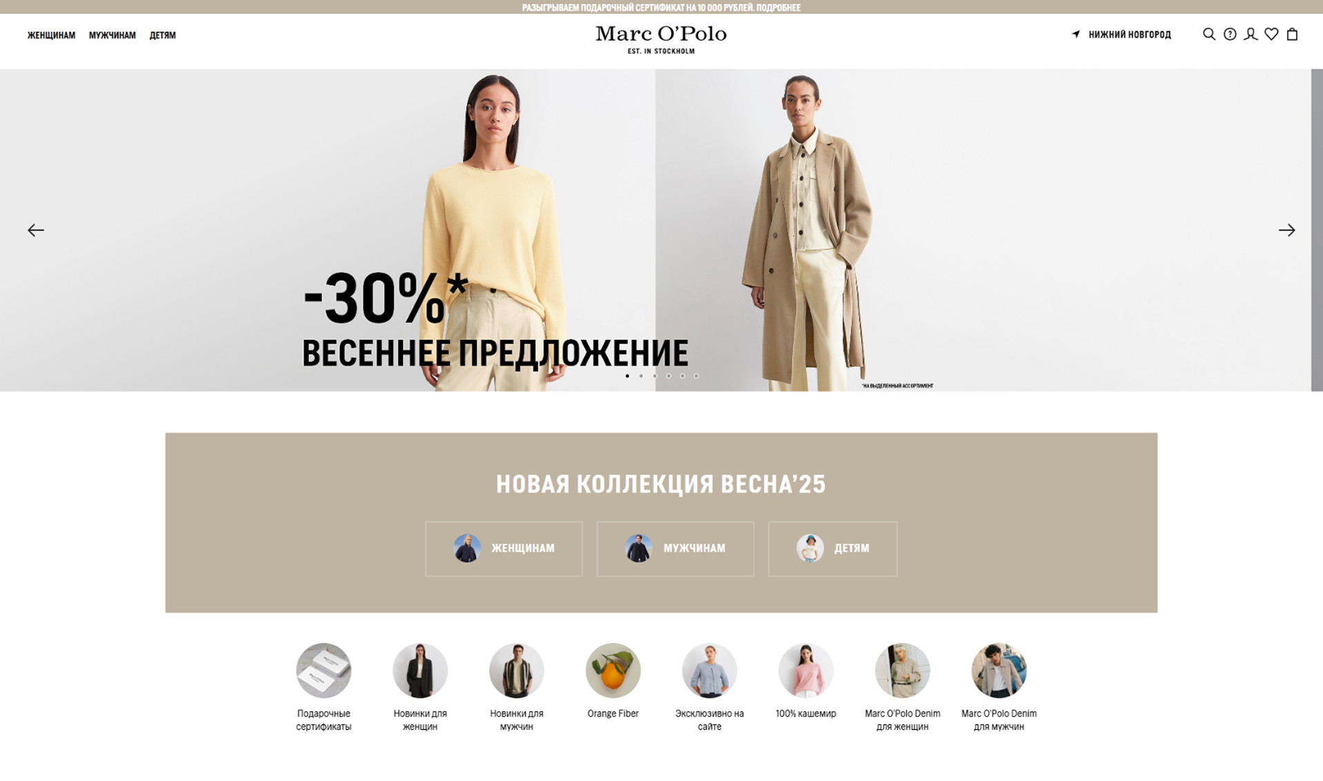 Небольшая историческая справка. Сам бренд был основан в 1967 году как небольшая компания в Стокгольме. На сегодняшний день Marc O’Polo насчитывает около 2300 сотрудников из более чем 40 стран. По этой причине решили взять один из зарубежных сайтов бренда и посмотреть насколько сильно он отличается от русской версии.