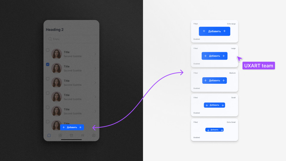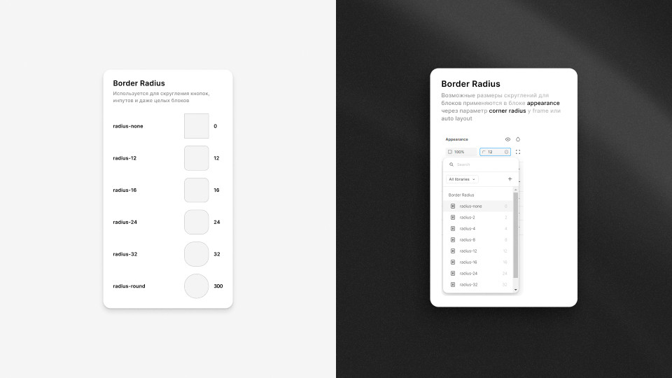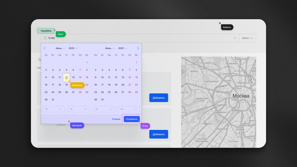 Я понимаю, что большая часть пользователей, которые прочитают эту статью так или иначе связаны с дизайном. Но для галочки давайте вкратце, что такое ДС и UI-kit (тоже важная переменная в этом рассказе). Заходим в гугл и видим следующую картину: Также стоит отметить, что дизайн-система реализовывается в виде кода. Следовательно, это не только инструмент для дизайнеров, но и для разработчиков, которые впоследствии будут с ней работать. UI-kit — визуальные элементы интерфейса, такие как цвета, шрифты, кнопки, иконки, формы, анимации и прочее. В контексте дизайн-системы — условно один из её подпунктов. Ключевая разница вот в чем — несмотря на наличие гайдлайнов, которые описывают разные сценарии в прототипировании, построении интерфейса и прочее, мы не можем называть это дизайн-системой в полной мере. ДС это сложный продукт, который расписывается до мелочей чуть ли не в пикселях. Здесь же хоть и присутствуют гайдлайны, но они не затрагивают все возможные сценарии. Формально, то что реализовал Иван можно назвать ДС, но, если мы рассматриваем все по четкой терминологии, то этот «продукт» все-таки что-то среднее между дизайн-системой и UI-kit. Мы же внутри студии как называли это дизайн-системой, так и называем. Для простоты, удобства, созвучности, можно придумать тысячу терминов, но просто нам так проще. С этим закончили, можем к истории создания приступать) Прошлая ДС не отвечала всем запросам. По ней банально нельзя было создать адекватные высокодетализированные прототипы. Она была топорной, тяжелой для понимания и, что самое главное, — не была гибкой. Ну и как вишенка на торте — она выглядела плохо с точки зрения визуала. Да, это не ключевое в дизайн-системах, но как факт упомянуть стоит. Помимо того, старая дизайн-система была сделана исключительно для вайрфрейминга (прототипов), т.к. элементы ДС это финальные элементы, которые используются в дизайне итоговых макетов и так далее. Мы же постарались уйти от этого, реализовав в ДС больший пласт элементов. Когда ты приносишь клиенту прототип/вайрфрейм, который приближен к реальному дизайну лучше показывать его в лучшем свете. Не зря говорят — встречают по обложке. Если на вашей работе кривые углы, проблемы со шрифтами и прочее, это может негативно сыграть на первом впечатлении. А оно чаще всего является ключевым в нашей нише. Реальных кейсов, когда бы мы принесли прототип по старой дизайн-системе и нас бы развернули, конечно, не было. Но это было делом времени. Дизайн меняется, клиенты с годами все лучше разбираются в нашей работе и получить отказ по крупному проекту из-за «недостаточно круглых» углов не хотелось. Постоянно вносить изменения в ДС в режиме реального времени начинало надоедать. Поэтому Иван принимает решение изменить правила игры и пересобрать все с нуля. В первую очередь были заведены токены. Условно: — Цветовые токены — Шрифтовые — Скругления... ...и так далее Далее мы пошли по принципу «атомарного дизайна»*. Атомарный дизайн — методология проектирования, которая разбивает интерфейс на составные части, начиная с самых простых элементов (атомов) и постепенно объединяя их в более сложные структуры (молекулы, организмы и т.д.). Давайте разберем на примере календаря: — самый «низкий» элемент — текст — далее — «атомы». Это базовые неразделимые и самостоятельные элементы. К ним мы можем от