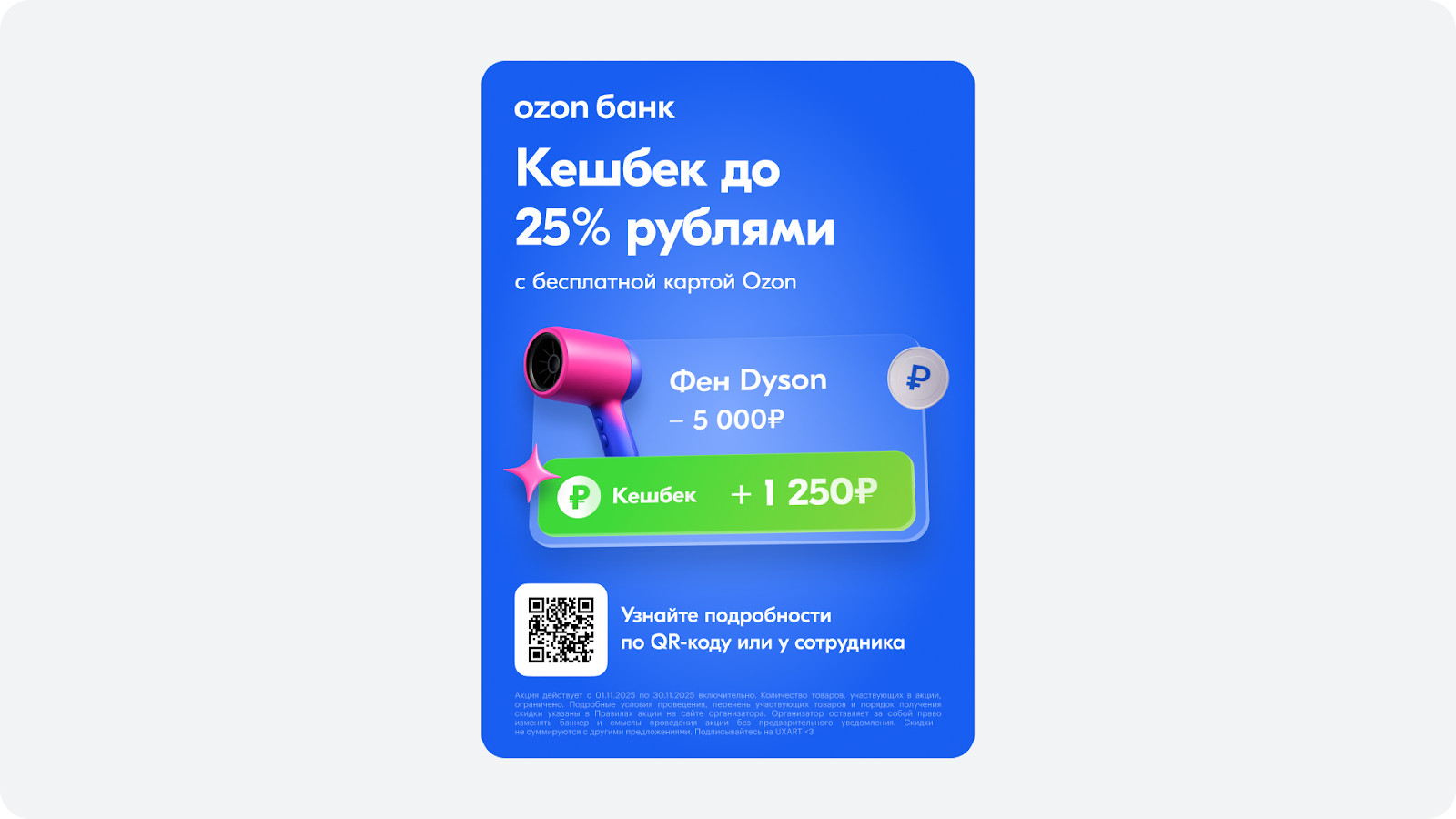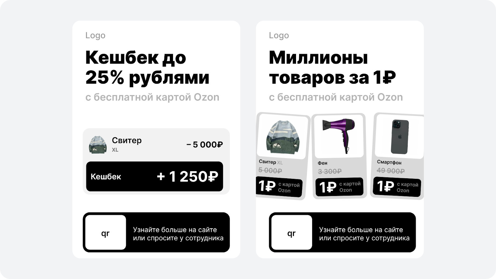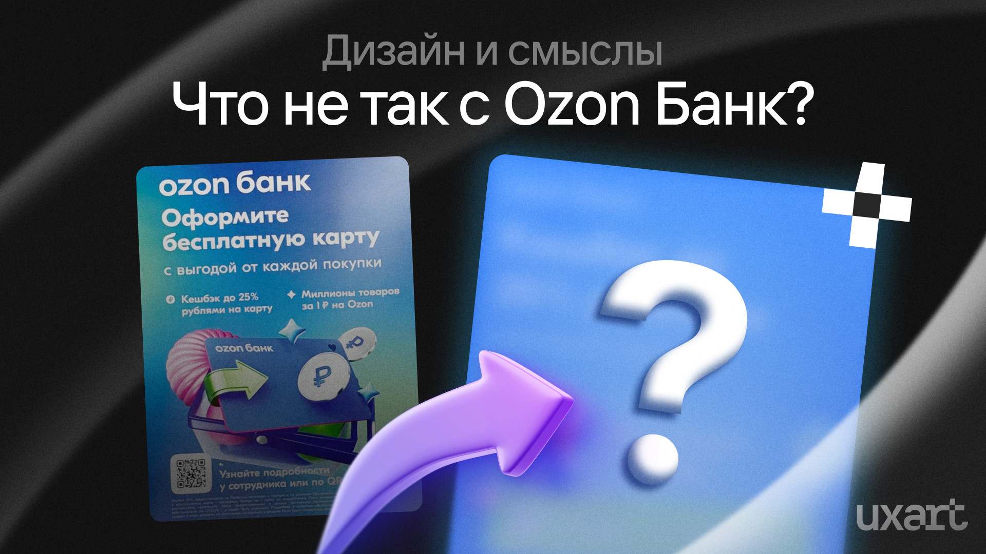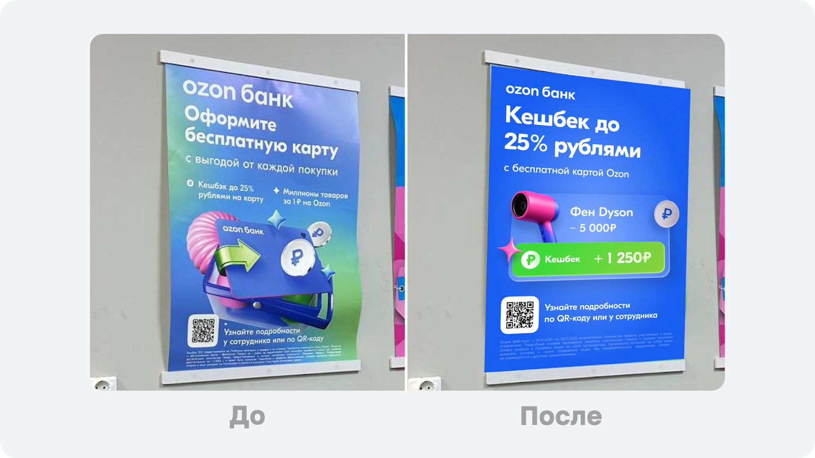 То есть бизнес стремится к простому и понятному — привлечь новых клиентов в банк.Но именно на этапе того, как эти смыслы передаются, и как они должны мотивировать пользователя, возникают основные проблемы. На первый взгляд баннер выглядит нормально, но если рассматривать его как инструмент коммуникации — начинаются проблемы. 1. УТП, которое теряется среди аналогов. Бесплатная карта — уже привычное предложение на рынке, поэтому пользователю сложно понять, чем именно это предложение лучше остальных. Вместо этого Ozon мог бы сильнее выделить то, что действительно делает продукт уникальным — например, крупный кэшбэк или возможность покупать товары за 1₽. Такие элементы обычно перетягивают внимание и помогают быстрее донести ценность. 2. Сильные преимущества остаются на втором плане. В реальных сценариях — в очереди, на улице, при беглом взгляде — человек тратит на баннер одну-две секунды. За это время он успевает увидеть только самое яркое. У конкурентов часто используют крупные цифры или визуальные акценты на выгоде — это помогает не потерять смысл в потоке информации. В нашем случае крупный «25%» или «1₽» могли бы стать тем самым «якорем», который удержит взгляд и сразу объяснит, в чём выгода. Например, можно посмотреть на баннер Т-Мобайл. На нем ключевые смыслы сразу бросаются в глаза: 3. Визуал не поддерживает сообщение. Корзина с картой выглядит узнаваемо, но мало помогает понять, о чём конкретно идёт речь. Тут визуал скорее нейтрален. Можно было усилить коммуникацию, используя изображение, которое ближе к сути предложения: бонусы, визуальные акценты на выгоде. Такой подход часто работает лучше — человек считывает идею за долю секунды и понимает, стоит ему читать текст или нет. У нас есть два реально сильных оффера — кэшбэк 25% и миллионы товаров за 1₽.По сути, этого уже достаточно, чтобы мотивировать человека оформить карту. Поэтому логично не пытаться запихнуть всё в один баннер, а сделать два — каждый с отдельным фокусом. Что же нам это дает: 1. Получаем два сильных УТП. Они сразу дают понятную ценность, выделяют предложение среди конкурентов, а крупные цифры привлекают внимание быстрее и понятнее. 2. Пространство для осмысленного визуала — можно построить композицию вокруг конкретной выгоды. Я понимаю, что у Ozon есть свои правила, и именно они часто определяют, каким может быть баннер: какие размеры, стили, уровни акцентов, какая графика «разрешена». Из-за этого многие элементы могут выглядеть именно так — не потому что дизайнер «плохо сделал», а потому что существуют рамки, которые задают определенные ограничения. Но если чуть отойти от этих жёстких правил и смотреть на процесс в первую очередь как на задачу коммуникации, баннер можно сделать заметно сильнее. Ниже — как и почему. 1. Уменьшаем логотип. Делаем фокус на предложении, логотип остаётся заметным, но не перетягивает внимание. 2. Крупные и информативные заголовки. Они подчеркивают выгоды и сразу цепляют взгляд. 3. Понятный визуал, ближе к интерфейсу. Делаем визуал, который помогает считать смысл, и побуждает изучить весь баннер 4. Заметный QR. Чтобы путь от интереса до действия был очевидным После доработки баннер стал чище, акценты расставлены логично, а визуал теперь помогает донести смысл, а не мешает восприятию. Второй баннер можете задизайнить сами, ждем варианты в ком