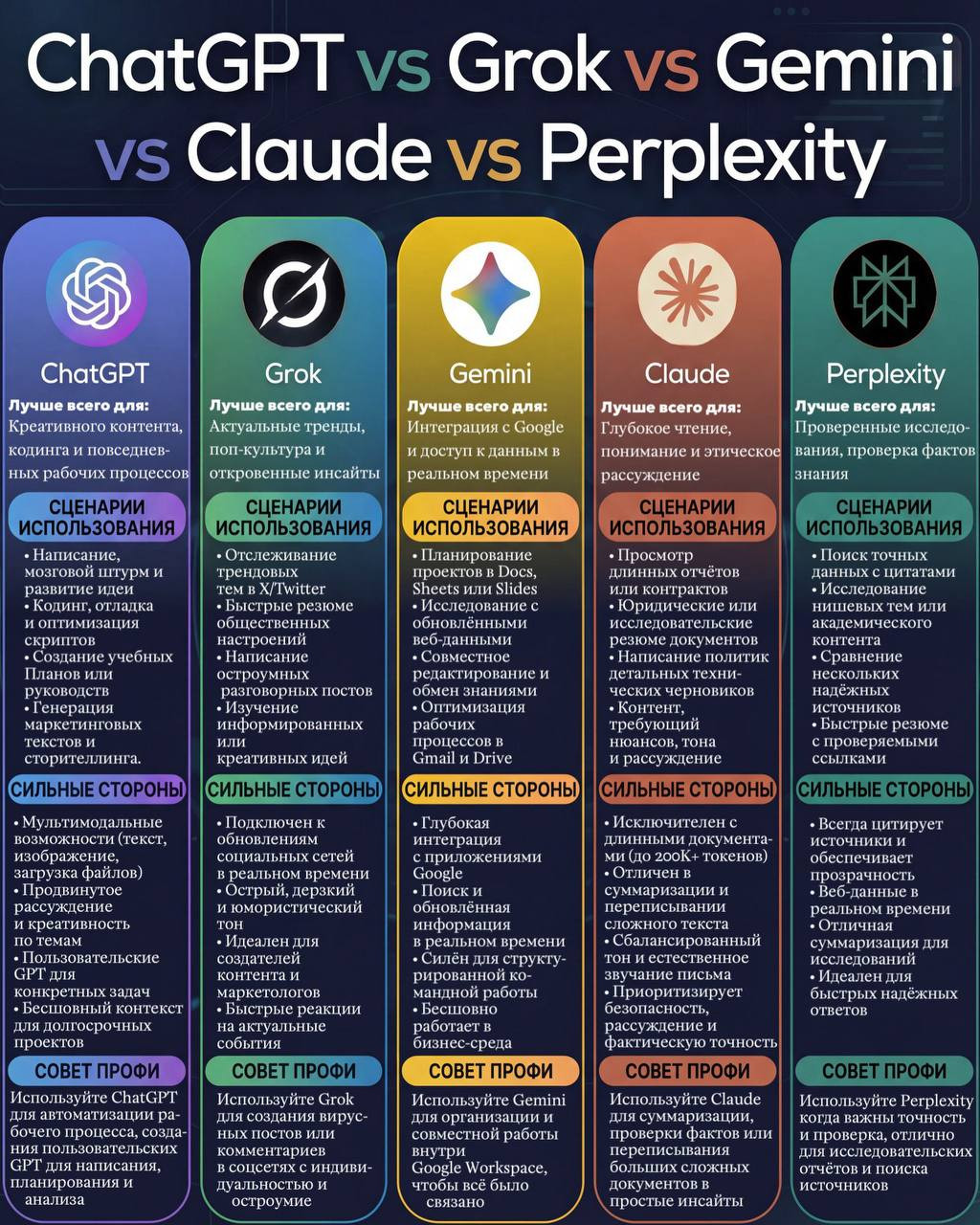 Современные нейросети перестали быть просто чат-ботами — сегодня это полноценные рабочие инструменты.ChatGPT, Grok, Gemini, Claude и Perplexity дополняют друг друга и решают разные задачи: от креатива до строгой аналитики.