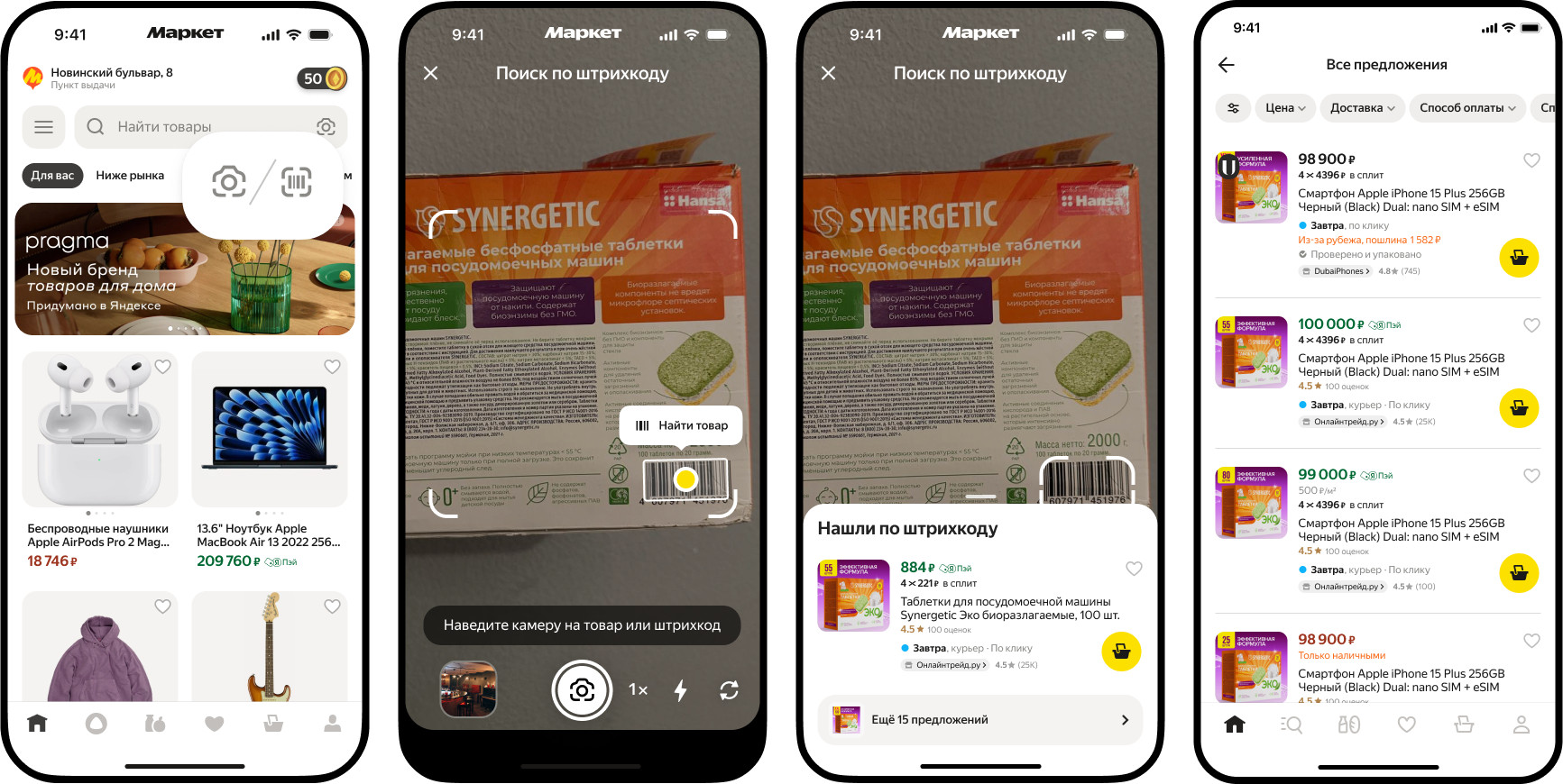 Кроме поиска похожих предложений по фото пользователи Маркета могут найти конкретный товар, отсканировав штрих-код на нём. Это позволит им быстро находить вещи в каталоге приложения, например, автоаксессуары для определенных моделей машин, расходники для бытовой техники и другие товары с уникальными кодами. Для этого нужно навести камеру на штрих-код на упаковке, после чего товар автоматически отобразится на Яндекс Маркете.