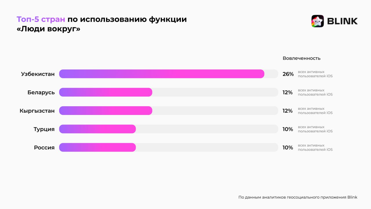 - Узбекистан стал лидером по доле вовлеченности — 26% всех активных пользователей iOS уже ознакомились с функцией. На его долю также пришлось 21% всех открытий и 14% пользователей, которые открыли «Люди вокруг».