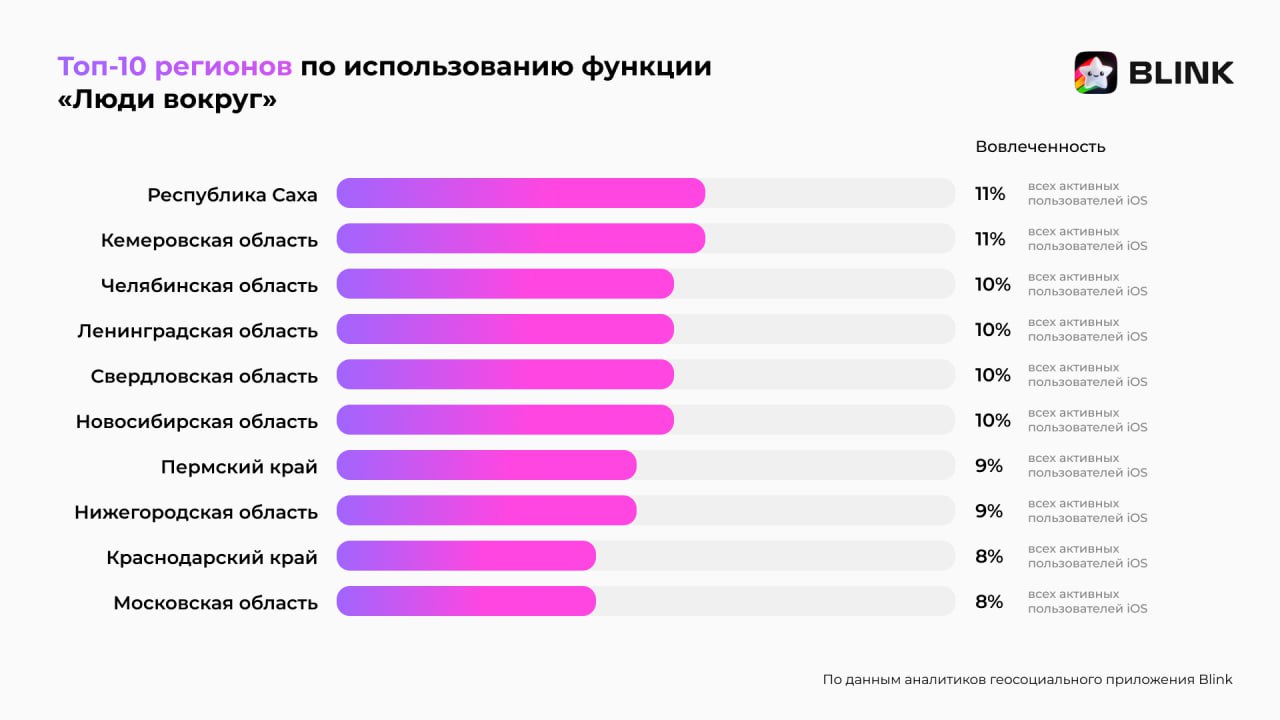 - Наибольшая вовлеченность зафиксирована в Республике Саха и Кемеровской области, где раздел «Люди вокруг» открывали 11% всех активных пользователей iOS. В топ также вошли Челябинская, Ленинградская и Свердловская области — по 10% вовлеченных пользователей.