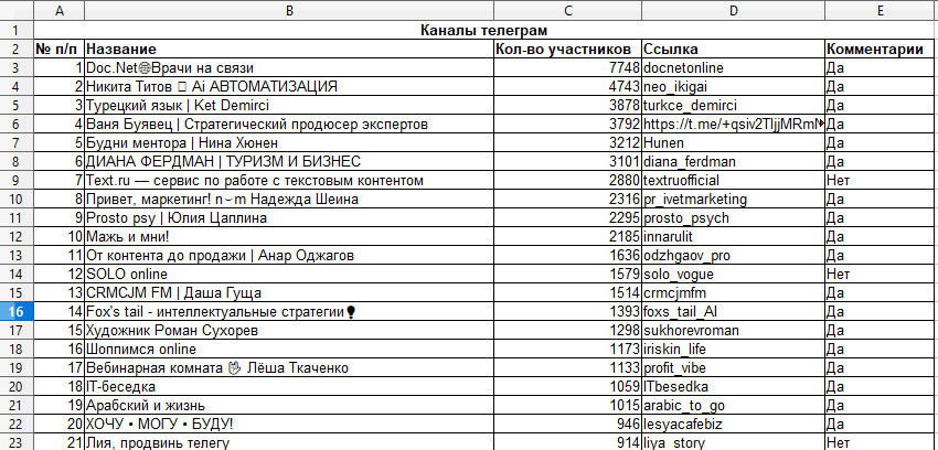 С их помощью можно получить: название канала, username и число подписчиков. Для более детального анализа приходится вручную просматривать каждый канал или чат, что особенно неудобно при поиске большого количества ресурсов (более 100). В таких случаях ведение таблицы в Excel становится необходимостью.