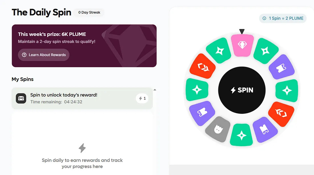 - Получайте бесплатное вращение каждые 24 часа и получите шанс выиграть PP, лотерейные билеты или даже токены $PLUME.