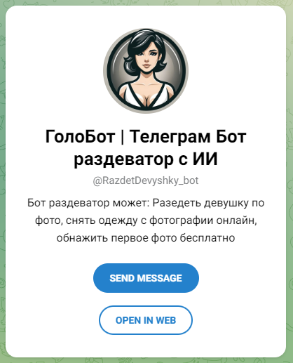 Цена (минимальная) — 150 руб. за 2 фотографии. Две тестовые обработки позволили раздеть по фото бесплатно, при этом фотография без одежды удивила высокой детализацией. Алгоритм выдает реалистичные изображения без фрагментов одежды, искажений или размытия. Несмотря на простоту, пользование порадовало наличием инструкции, что позволяет сразу снять все вопросы. Описание: Бот раздеватор отличается быстрой обработкой фото. Отличительной особенностью является возможность раздевать парней. Также можно выбирать фильтры шибари или БДСМ. При этом выдается два варианта в каждом стиле. Для получения реалистичной картинки важно, чтобы на фото было как можно меньше одежды, которая контрастирует с фоном. Как купить: Бот — t.me/goddesseyes_bot Быстрый ТГ-бот, раздел по фото за считанные секунды. Нужно отдать должное разработчикам, они потрудились на славу и сделали детальные инструкции использования. Вдобавок у алгоритма есть дополнительные опции, которые позволяют получить желаемый результат. Расценки 149 руб за 3 фото. Описание: Как для бота, это довольно серьезная нейросетка для раздевания девушек: поддержка, реферальная программа, кнопка с оплатами и техподдержкой. Есть возможность получить бесплатные вращения, если пригласить трех друзей. Опция раздевания включает быстрое оголение и коррекцию с персональными настройками для достижения желаемого эффекта. Ссылка — t.me/nudifikator_bot Популярный бот для раздевания девушек, о котором много слышал, но тестировал впервые. На практике создает отличные нюдсы без одежды даже в тестовом режиме. Размытие практически отсутствует и детализация алгоритма высокая. Цена — 150 руб за 2 фото. Описание: Стандартный бот, который раздевает по шаблонным пунктам меню. Кроме прикрепления фото для работы, есть кнопки личного профиля, поддержки и оплаты. Присутствует партнерка и возможность использования промокодов. При возникновении сложностей можно воспользоваться инструкцией. Как купить: Бот ТГ: t.me/NuOnlyLand_bot Цена (минимальная): 150 руб за 2 фотографии. Неплохая нейросетка, которая раздевает алгоритмом с высоким качеством снимков. Отлично справляется с раздеванием даже при относительно большом количестве одежды. Все же мой тест девушки в платье не продемонстрировал отличного снимка. При этом скорость обработки сервиса практически не уступает аналогам. Описание: По классике для старта нажимаем кнопку «Начать», после чего следует пользовательское соглашение. После подтверждения уже можно приступить к самому раздеванию, загрузив интересующее фото. Есть возможность смены языка и участия в реферальной программе. Используя партнерку, можно копить средства и пользоваться ботом для раздевания бесплатно. Способы оплаты: Бот в тг: t.me/Intim_Nuds_super_Bot Цена (минимальная): 150 руб за каждые две фотографии. Еще один достойный бот с невероятно быстрым раздеванием женщин на фото. Если говорить честно, то на моих снимках по телу кое-где остались фрагменты одежды, что конечно негативно сказывается на общем впечатлении. Хотя вторая фотография, где девушка была только в купальнике (то есть почти без одежды) была обработана сервисом вполне хорошо. Описание: При заходе нужно подтвердить ознакомление с правилами после чего будет предоставлена детальная инструкция работы с ИИ. Есть переход на основной канал и примеры обработок. Что касается опци
