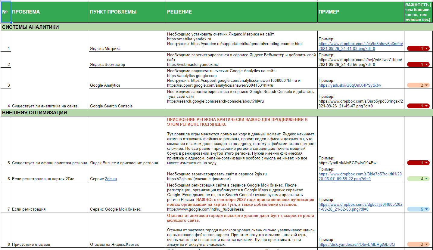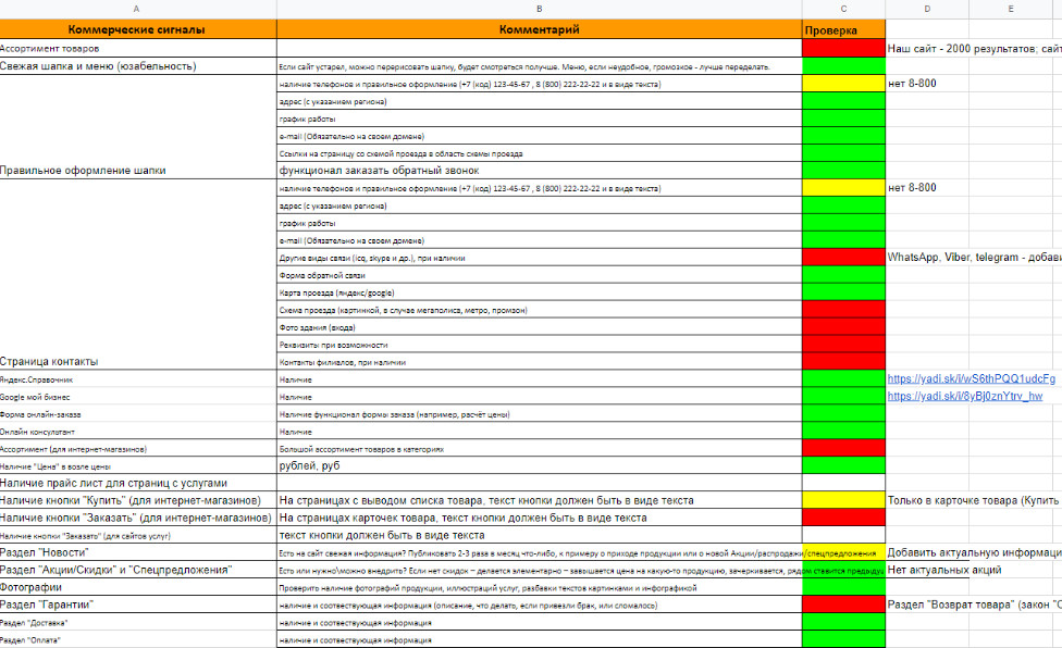 Это некоторые из пунктов что были выданы клиенту для устранения. Задача стояла, чтобы он уже начал вносить корректировки на сайт, чтобы шла работа и уже пошли первые движения проекта.