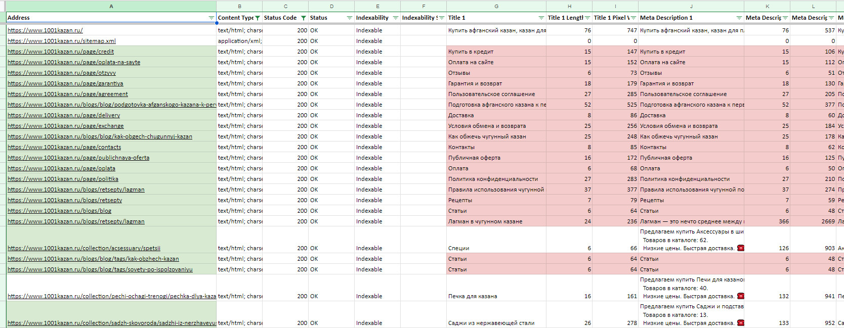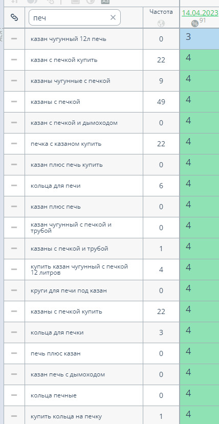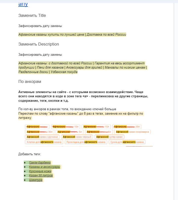 3. Создание информационного контента для привлечения целевого трафика и конвертации его в продажи. На начальном этапе было крайне важно собрать максимум информации и провести всесторонний анализ, чтобы выявить сильные и слабые стороны продвигаемого сайта, а также изучить конкурентов и лидеров рынка. Данный этап включал в себя следующие шаги: 1.1 Анализ конкурентов и ведущих сайтов Первым делом был проведен детальный анализ конкурирующих интернет-магазинов в Липецком регионе. Мы изучили их ассортимент, ценовую политику, маркетинговые акции, видимость в поисковых системах и другие ключевые факторы. Это позволило определить их сильные и слабые стороны, актуальные тренды в данной нише. Дополнительно были исследованы молодые, но уже успешно ранжируемые сайты из ТОП-10 поисковой выдачи по Москве в тематике «Казаны». Мы изучили лучшие практики юзабилити и структурирования информации на данных ресурсах, эффективные решения по категоризации товаров и представлению ключевого контента. На основе проведенного анализа была составлена карта типовых страниц с примерами лучших решений, которые необходимо было реализовать для повышения конверсии и улучшения видимости в выдаче. 1.2 Техническая проверка сайта Следующим важным шагом стала детальная техническая проверка сайта интернет-магазина. Для этого использовался сервисलabrika, позволяющий выявлять широкий спектр технических ошибок и проблем. Дополнительно была проведена ручная ревизия по обширному чек-листу из более 200 пунктов. В результате были выявлены многочисленные недочеты: дублирование контента, неоптимизированные заголовки и метаданные, некорректная файловая структура, проблемы с распределением ключевых элементов в HTML-коде и целый ряд других моментов, негативно влияющих на индексацию и ранжирование сайта. 1.3 Формирование ТЗ на доработки По итогам анализа конкурентов и технического аудита сайта было сформировано детальное техническое задание с рекомендациями по доработкам для существенного улучшения юзабилити, повышения конверсии и оптимизации сайта под требования поисковых систем. В ТЗ вошли следующие ключевые пункты: — Перелинковка категорий с помощью плитки тегов для улучшения структуры — Написание качественных SEO-текстов в категориях для раскрытия семантики — Формирование полноценного блога для публикации информационного контента — Исправление выявленных технических недочетов — Улучшение юзабилити на основе лучших практик ведущих конкурентов Данное ТЗ было передано заказчику для реализации намеченных улучшений на сайте. На время выполнения этих работ мы параллельно начали оптимизацию активной семантики, что будет подробно рассмотрено в следующем разделе. Параллельно с выполнением заказчиком работ по доработке сайта согласно переданному техническому заданию, мы приступили к важному этапу оптимизации активной семантики. Под активной семантикой понимаются запросы, по которым на сайт уже переходили посетители из поисковых систем за определенный период. Ключевой задачей было усилить видимость уже «работающих» страниц и закрепить имеющиеся позиции. 2.1 Сбор и анализ активной семантики На первом шаге был собран массив запросов, по которым на сайт переходили пользователи через поиск за последние 3 месяца. Источником данных послужили отчеты по по