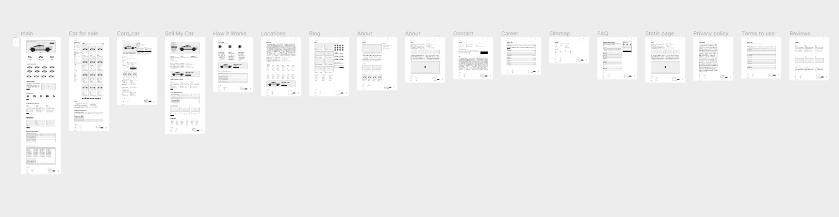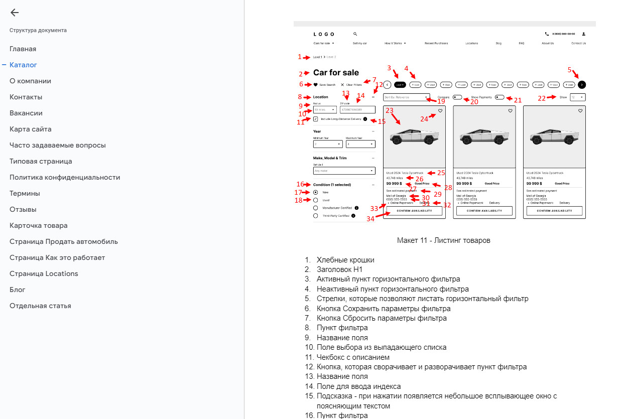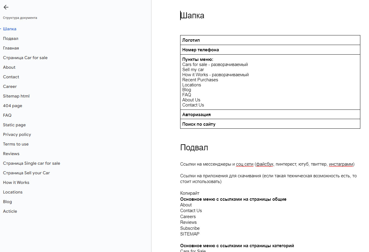 На основе проведенного анализа конкурентов и с учетом специфических требований заказчика, мы определили основные типы страниц, необходимые для сайта по выкупу автомобилей. Среди них: главная страница, каталог автомобилей, карточки товаров, страницы с информацией о компании, FAQ, блог и другие.