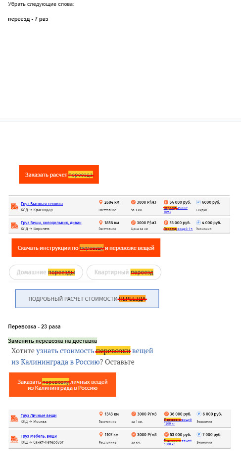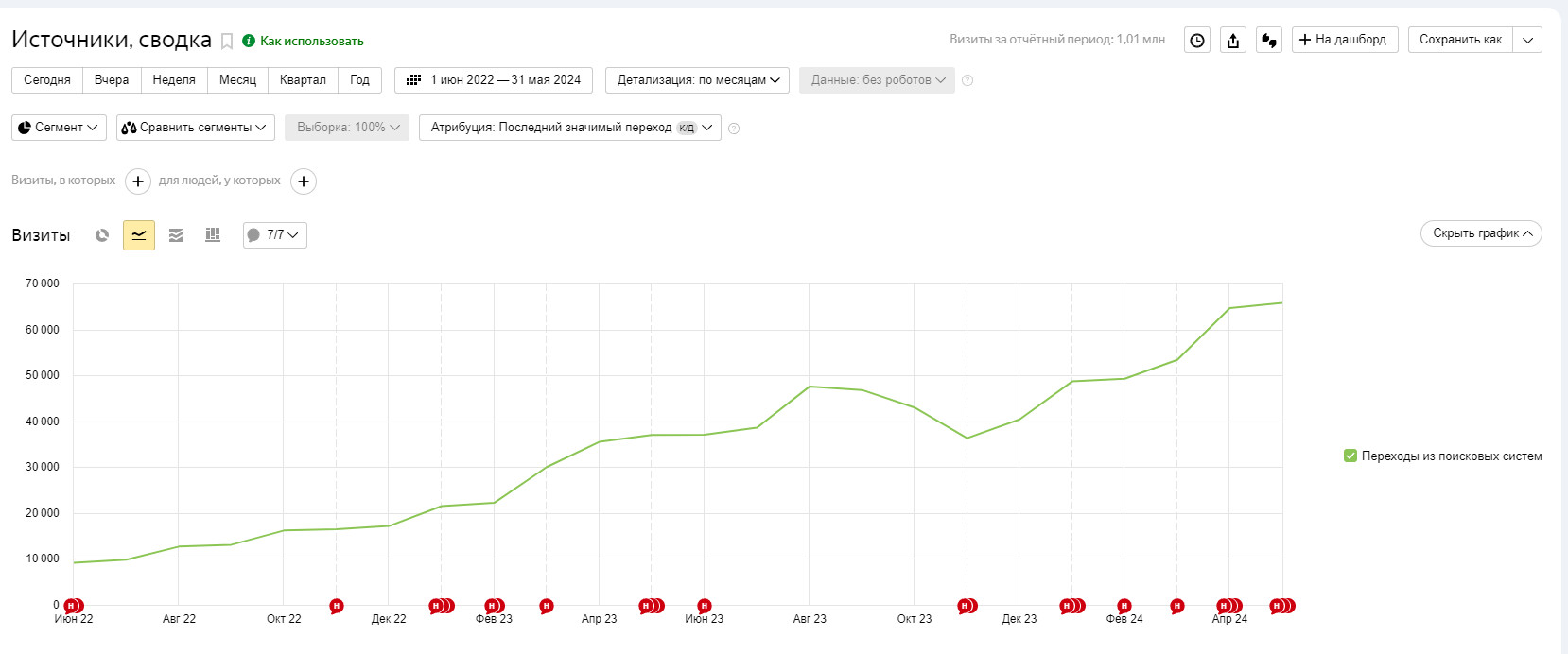 Анализ конкурентов и рынка Перед началом активных SEO-работ был проведен тщательный анализ ключевых игроков рынка грузоперевозок и их присутствия в интернете. Были изучены сайты таких компаний, как ГрузовичкоФ, Деловые Линии, ПЭК, Желдорэкспедиция и другие. Анализ конкурентов позволил выявить их сильные и слабые стороны в сфере SEO, оценить стратегии продвижения и определить возможности для выделения грузоперевозок среди основных игроков рынка. Также были изучены популярные поисковые запросы в данной тематике и тренды потребительского поведения. Результаты анализа послужили отправной точкой для формирования эффективной SEO-стратегии для грузоперевозок, учитывающей специфику рынка грузоперевозок и особенности поведения целевой аудитории. Аудит текущего состояния сайта Следующим важным шагом стал комплексный аудит сайта компании грузоперевозок. Были тщательно проанализированы следующие аспекты: По результатам аудита были выявлены следующие критические проблемы, негативно влияющие на видимость сайта в поисковых системах: Устранение этих ключевых ошибок заняло около 3 месяцев плотной работы и стало первым шагом на пути к оптимизации сайта компании. Параллельно специалисты разработали рекомендации по улучшению дизайна и структуры сайта для повышения удобства навигации, визуальной привлекательности и конверсии. Многие из этих рекомендаций были внедрены клиентом в ходе дальнейших работ. После завершения подготовительного этапа работы были сконцентрированы на позиционной оптимизации уже имеющихся на сайте страниц. Этот процесс занял около 6 месяцев и включал в себя следующие ключевые действия: Сбор семантического ядра Одним из первых шагов стало выявление и сбор наиболее релевантных и высокочастотных поисковых запросов, связанных с услугами грузоперевозок. Для этого использовались специализированные инструменты, такие как Key Collector, AnswerThePublic, Serpstat и другие. Был проведен глубокий анализ, позволивший составить обширное семантическое ядро, включающее как ключевые коммерческие запросы (например, «грузоперевозки Москва», «перевозка грузов цена» и т.д.), так и информационные запросы, отражающие интересы пользователей на разных этапах принятия решения. Сформированное семантическое ядро легло в основу дальнейшей работы по оптимизации контента страниц под наиболее значимые и высокочастотные поисковые фразы. Оптимизация тегов и заголовков Следующим шагом стала непосредственная оптимизация ключевых элементов страниц под ключевые слова из собранного семантического ядра. Были оптимизированы: Оптимизация тегов и заголовков под приоритетные ключевые слова помогла повысить релевантность страниц для поисковых систем и обеспечить лучшее соответствие потребностям пользователей. Обогащение и расширение контента Важным аспектом позиционной оптимизации страниц стала работа с их текстовым наполнением. В процессе этой работы: Обогащение и расширение текстового наполнения страниц, проведенное с учетом актуальных интересов целевой аудитории, способствовало улучшению видимости сайта в выдаче поисковых систем по релевантным тематическим запросам. Работа со структурированными данными На этапе позиционной оптимизации также выполнялась работа по внедрению структурированных данных (схем) на страницах сайта грузо