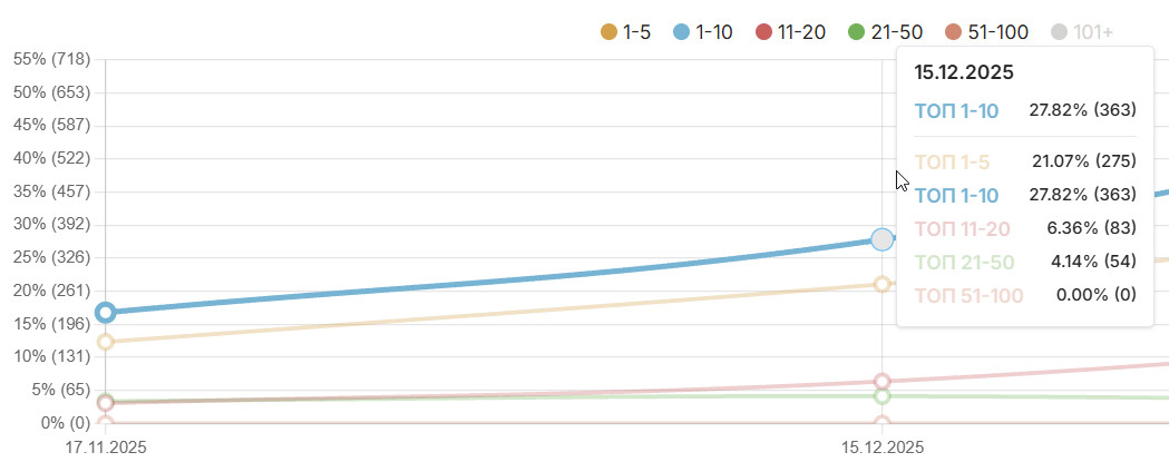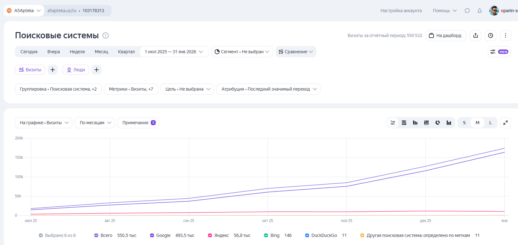 ✅ 4. Настройка хлебных крошек и внутренних ссылок Уже в течение 2–3 недель после публикации новой структуры мы зафиксировали: После того как мы выстроили технический фундамент и логичную структуру сайта, настал этап, без которого невозможен устойчивый рост органического трафика — семантическая оптимизация. Семантика — это не просто набор ключевых слов. Это система запросов, с помощью которой пользователи формулируют свои намерения. Когда человек пишет в поиске «таблетки от головной боли» или «глюкометр купить в Ташкенте», он выражает потребность. Наша задача — понять и структурировать этот язык, чтобы: ✅ 1. Структурировали семантическое ядро по приоритетам ✅ 2. Подготовили релевантные метатеги для всех страниц ✅ 3. Внедрили структуру для новых страниц На предыдущем этапе мы собрали и кластеризовали семантику. Следующий логичный шаг — создание посадочных страниц под целевые кластеры запросов. Это не просто «добавить больше страниц», а выстроить грамотную стратегию масштабирования сайта, которая увеличивает охват и глубину трафика без дублирования или конкуренции между разделами. ✅ 1. Выделили кластеры, требующие новых страниц ✅ 2. Подготовили шаблоны технических заданий для внедрения новых страниц ✅ 3. Создали приоритетную очередь внедрения ✅ 4. Передали ТЗ клиентской команде и наладили процесс контроля Даже при частичной реализации (примерно 40–45% от всего запланированного массива), мы увидели: Каждый SEO-проект можно оценивать с разных точек зрения: по выполненным задачам, внедрённым улучшениям, налаженным процессам. Но для бизнеса всегда на первом месте стоит вопрос: что это дало на выходе? Как изменились ключевые показатели? Насколько окупились вложения? И есть ли уверенность, что рост — не временный всплеск, а результат, на котором можно строить дальнейшее развитие? Проект с A5apteka.uz — как раз пример того, как системный подход даёт устойчивый, прогнозируемый рост. Ниже — результаты, которых мы достигли к январю 2026 года, спустя 2 месяца после старта активной работы. Самый наглядный и осязаемый показатель — это динамика трафика из поисковых систем. До начала работы (октябрь 2025) сайт имел 69 000 визитов в месяц из органики. Уже к январю этот показатель вырос до 174 211 визитов/мес, что составляет рост в 2 раза. Важно подчеркнуть: По данным систем мониторинга (Serpstat, Google Search Console): Хотя мы не управляли непосредственно заказами, благодаря интеграции с аналитикой стало видно: Таким образом, SEO‑трафик стал не просто большим, но и более «качественным» — это пользователи, которые активно взаимодействуют с сайтом и совершают действия. После реализации наших рекомендаций и внедрений клиентской команды: Часть новых страниц, созданных по нашим ТЗ, была внедрена уже в октябре-ноябре: Это не эффект «одной доработки». Рост трафика стал результатом сочетания факторов: Все эти элементы работали в комплексе, усиливая друг друга и создавая эффект синергии. На момент завершения активной фазы работ (декабрь 2025 года) проект A5apteka.uz вышел на качественно новый уровень: При этом мы сознательно не рассматривали декабрь как финальную точку. Напротив — вся стратегия строилась с прицелом на долгосрочную реализацию. Поэтому в начале 2026 года мы совместно с клиентом зафиксировали приоритеты на следующий этап развития. Проект A5apteka.uz — пример того, как мож