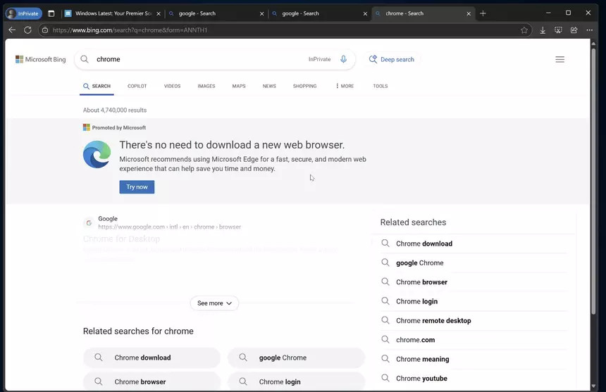 Теперь ссылка на загрузку Google Chrome скрыта за кнопкой «See more». Microsoft объясняет эти действия стремлением снизить доминирование Google на рынке поиска и укрепить позиции в конкуренции браузеров, отмечает Windows Latest.