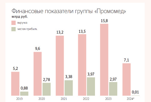 Выручка «Промомеда» по МСФО в первом полугодии 2024 г. выросла год к году на 22% до 7,1 млрд руб. Чистая прибыль за этот период составила 5 млн руб. по сравнению с 465 млн руб. годом ранее. Снижение показателя в компании объяснили ростом процентных расходов, разовыми расходами на IPO, а также созданным резервом по налогу на прибыль в отношении ранее признанных расходов. Показатель EBITDA за отчетный период вырос на 54% — до 2,3 млрд руб. Рентабельность по EBITDA увеличилась до 32% по сравнению с 25% годом ранее. Чистый долг по состоянию на 30 июня составил 17,7 млрд руб.