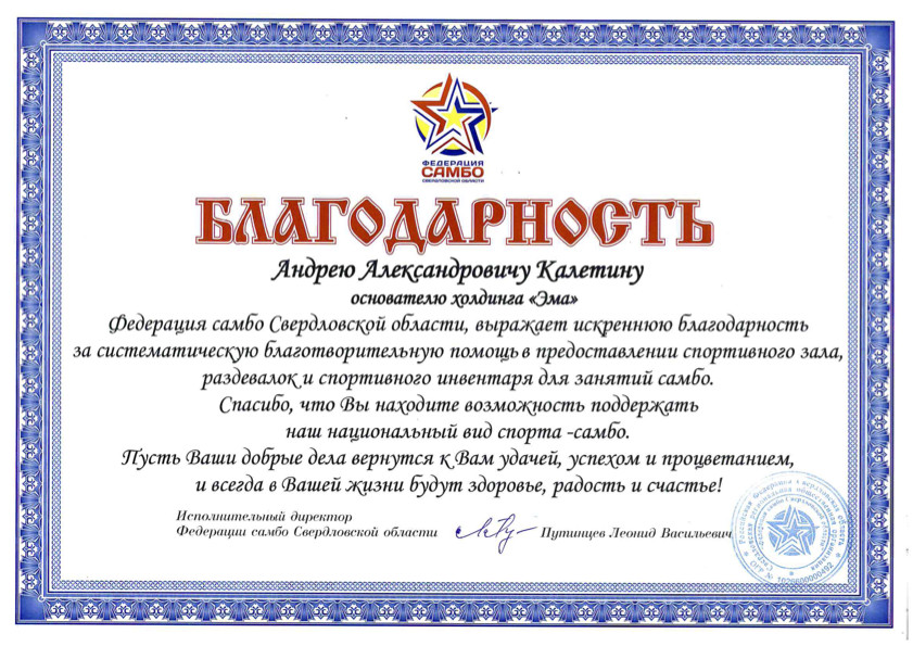 Федерация Самбо Свердловской области поблагодарила руководителя инновационного холдинга «ЭМА» Андрея Александровича Калетина за поддержку национального вида спорта — самбо