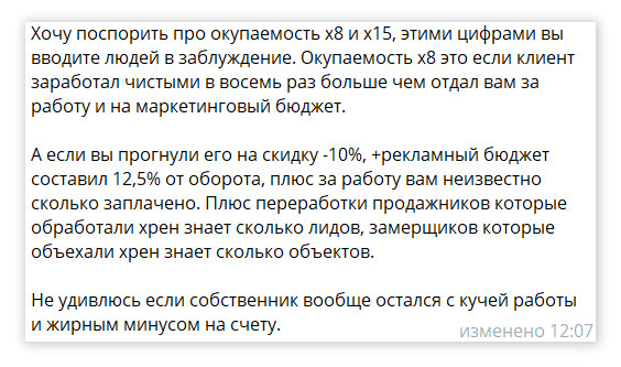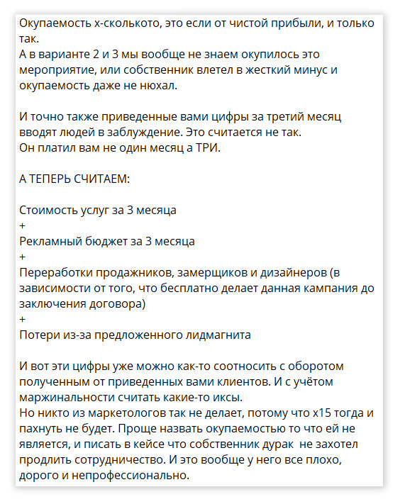 Ответ: При рентабельности ниже 6,7% — нет, при рентабельности 6,7-8% — спорно, при рентабельности выше 8% — перспективно. Только учитывайте, что окупаемость может расти из месяца в месяц, и конечно же, имеет свойство и падать. Важно следить за динамикой. Для более глубокого анализа и понимания, как реклама влияет на общий бизнес, лучше использовать ROI или ROMI. Мы стараемся быть максимально прозрачными, насколько можем, и считаем то, что можем. Конечные расчеты — за финансовым отделом компании. Комментарий подчеркивает важность учета всех затрат и правильного периода анализа. Если рентабельность у данного клиента выше 7%, то третий месяц для него точно был прибыльным. Мы согласны, что долгосрочные затраты и результаты тоже важны. Но также важна динамика с х8 до х15 за 3 месяца. Когда мы решаемся начать бегать, мы всегда начинаем с небольших дистанций в 1 км и наращиваем результаты постепенно. На большом отрезке мы можем увидеть, какой из нас получился бегун. Промежуточные результаты для нас же служат подтверждением, насколько нам подходит этот спорт. Получается ли бегать больше? Тренируется ли выносливость и дыхание? Не так ли? В заключении хочется пожелать удачи всем мебельщикам в этом сезоне. Высоких вам продаж! Получить план привлечения клиентов из «ВКонтакте» и расчет окупаемости вложений можно здесь https://www.мебельный-маркетинг.рф