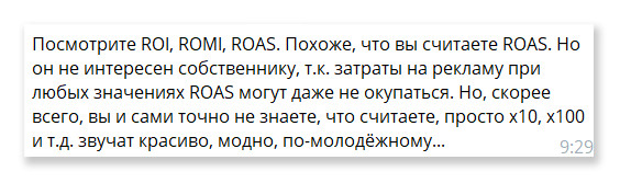 Если рентабельность вашего бизнеса ниже 9%, то х11 от рекламных вложений для вас обернутся убытками. Если рентабельность выше 9%, то х11 от рекламных вложений для вас обернутся прибылью. Для более точного просчета можете воспользоваться формулой из примера.