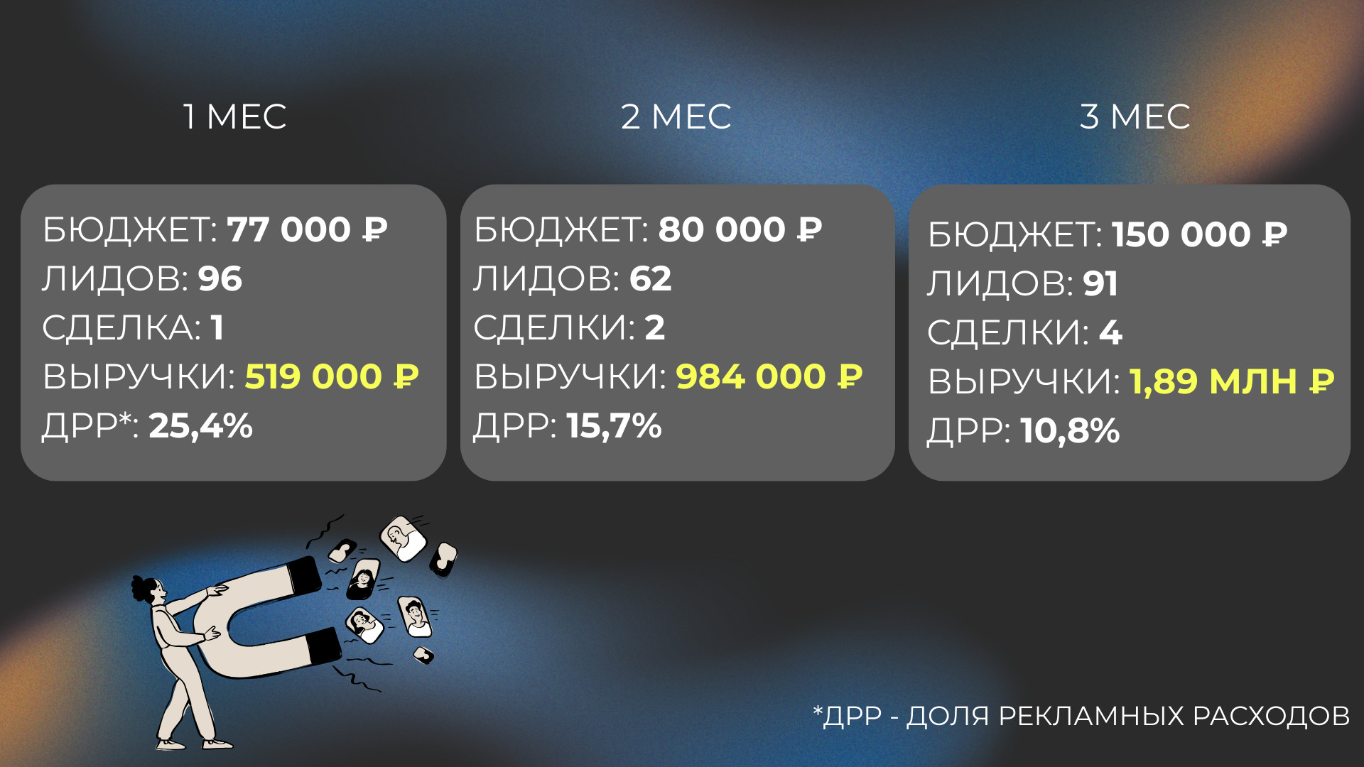 Изначально специалист пообещал, что результат в деньгах будет именно на 3-й месяц, поэтому ждали. Сергей знал, что ВК, как канал привлечения, точно работает. Лиды продолжали идти, но глобально ничего не изменилось — то же количество, то же качество.